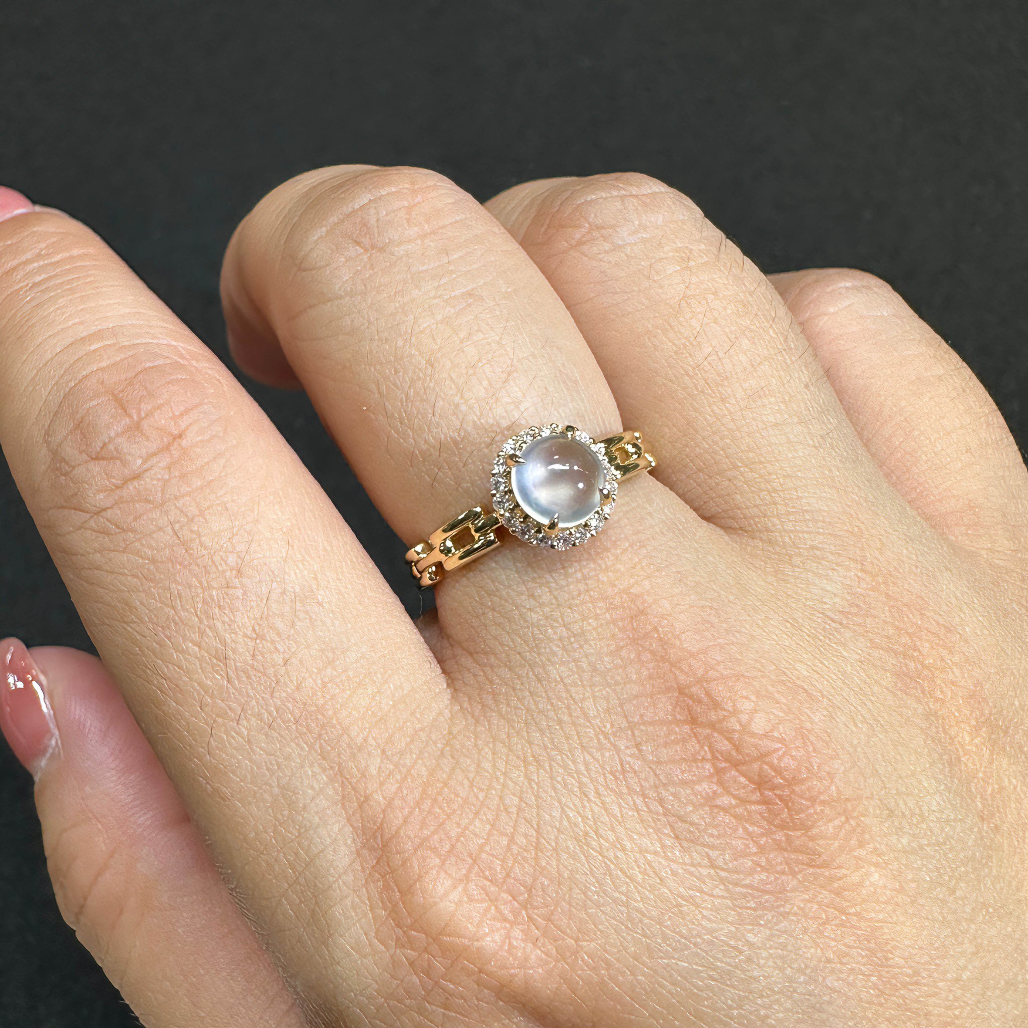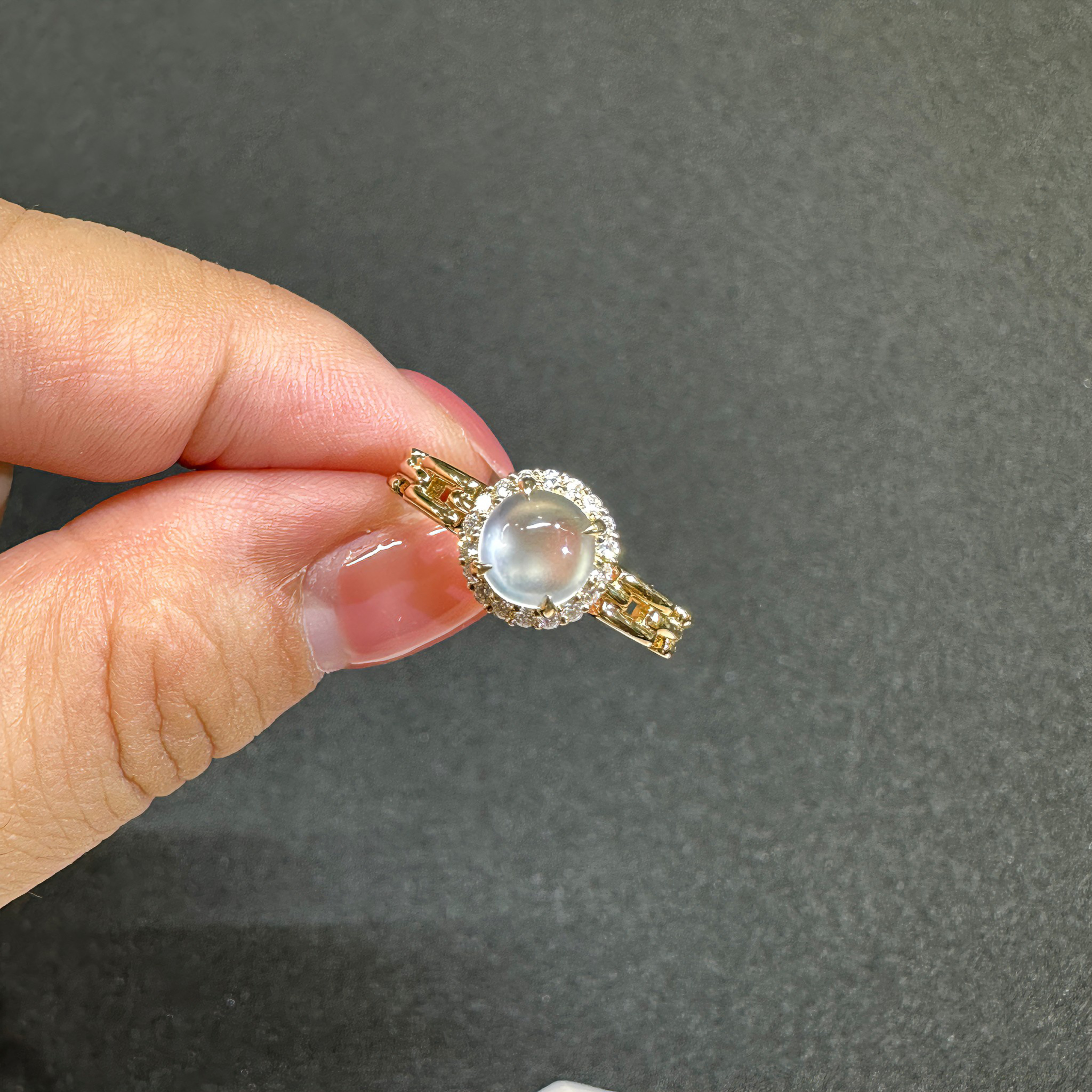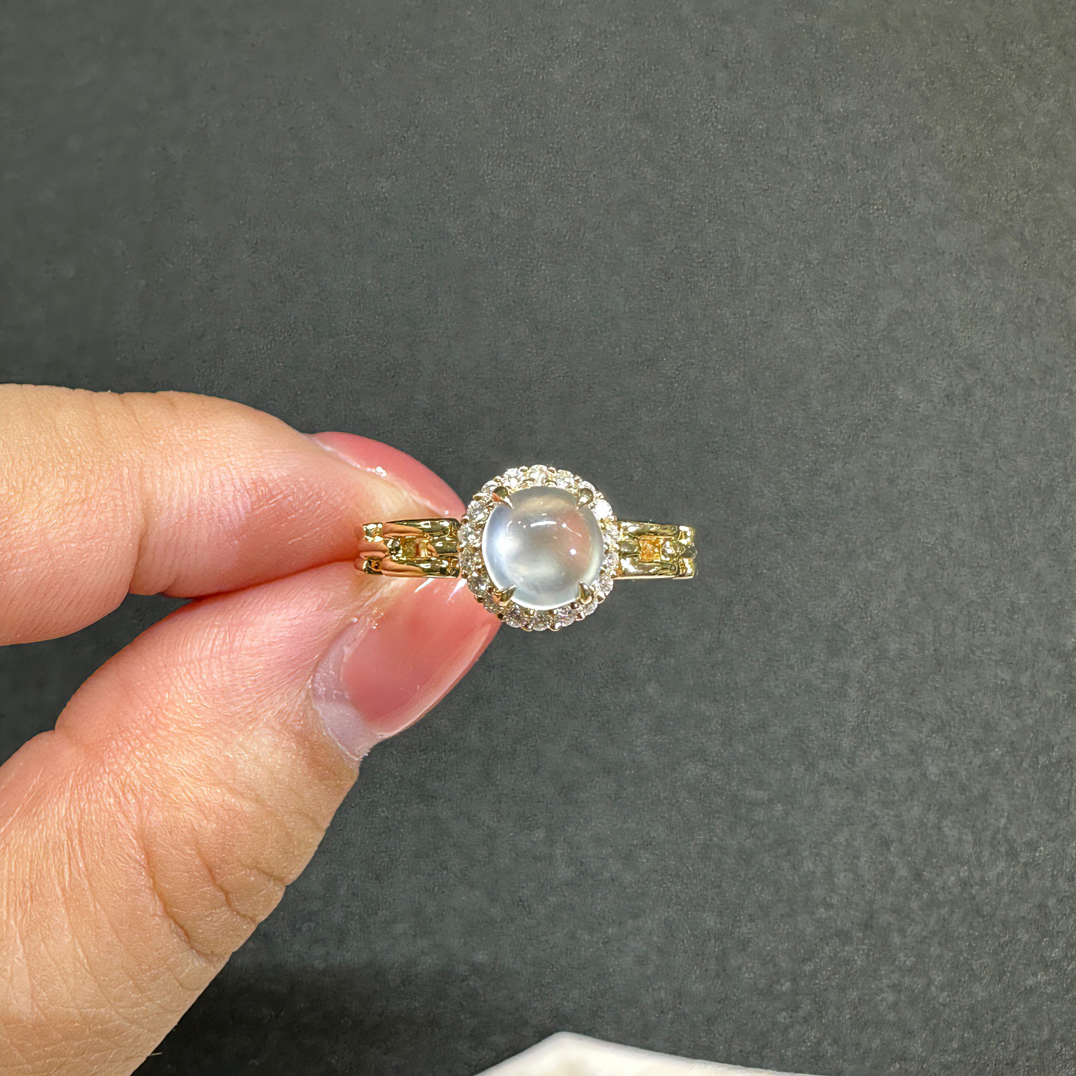 您的位置:他他商城  >   >  缅甸A货玻璃种白冰翡翠蛋面戒指18k黄金钻石双眼皮起钢光钢蛋女戒