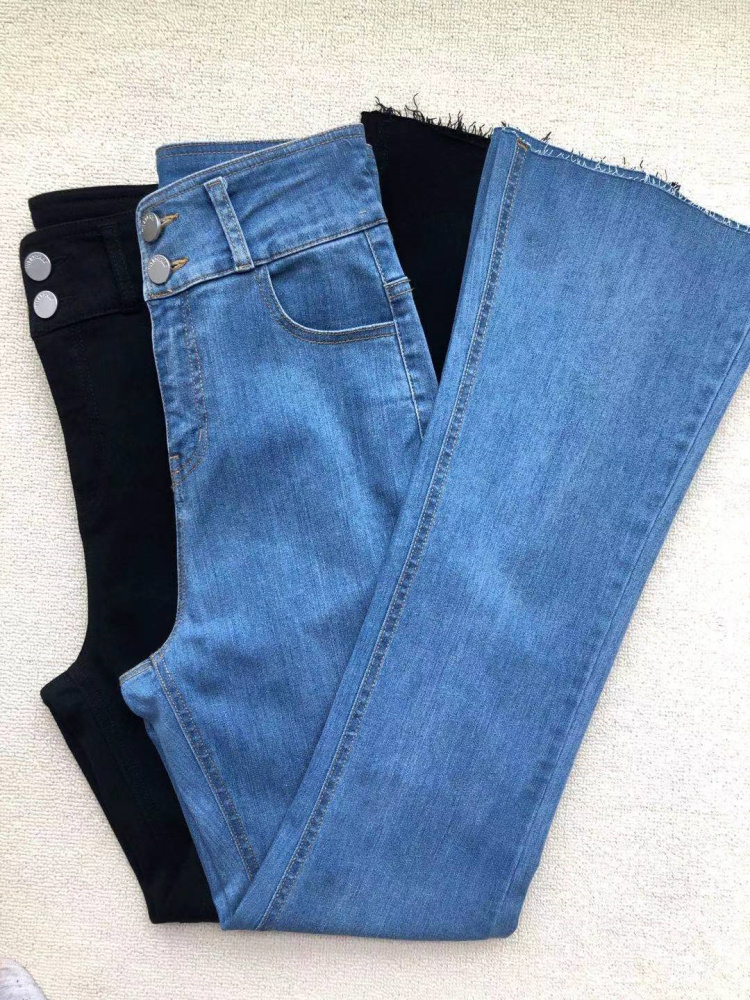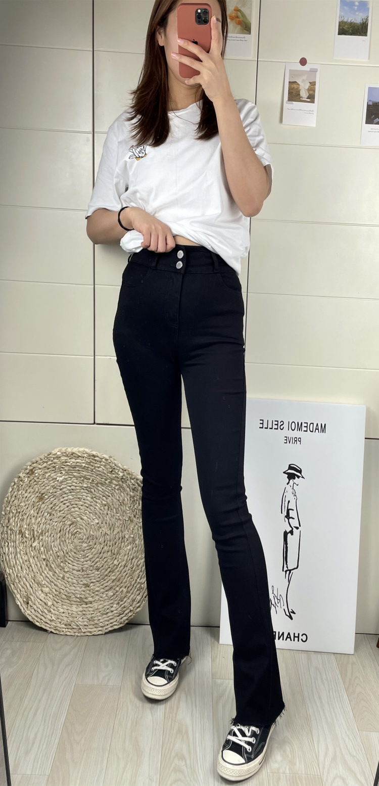 C家薄款高腰双扣黑色拖地四面弹力棉牛仔布显瘦阔腿微喇叭长裤女 - C家牛仔裤原单工厂直供店 打底裤小脚裤女