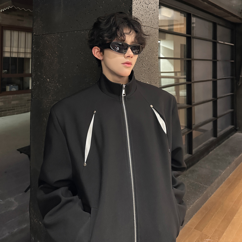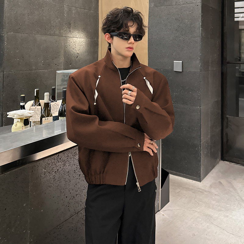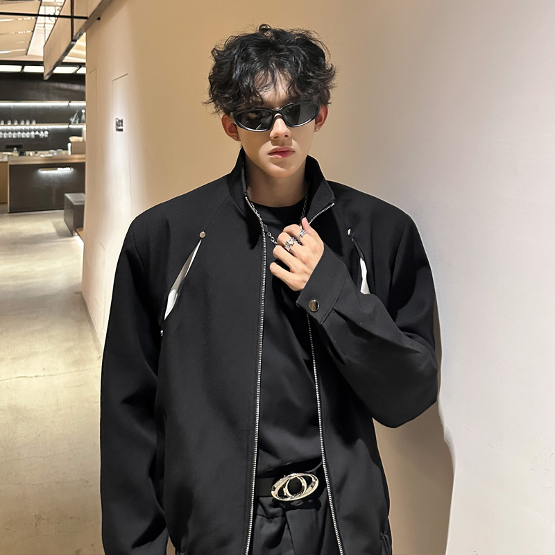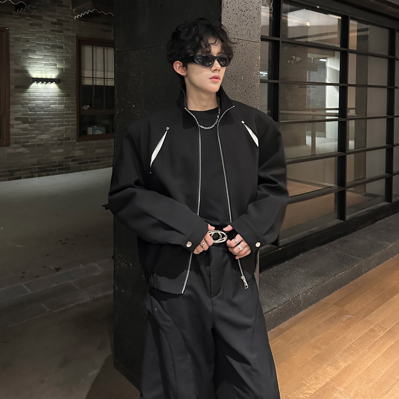 飞行员夹克男外套小众解构短款垫肩撞色立领夹克韩版男模高级痞帅 - 我爱文艺美型男