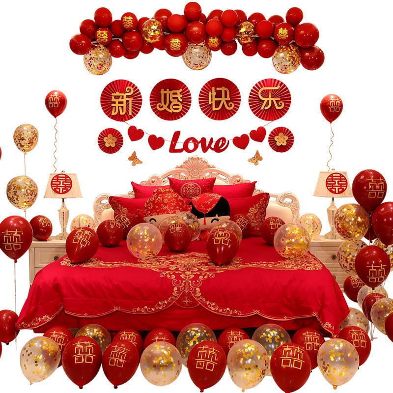 婚房装饰布置气球套装男方卧室女方新房拉旗彩带扇花婚礼结婚用品 - 醋慷设计商贸