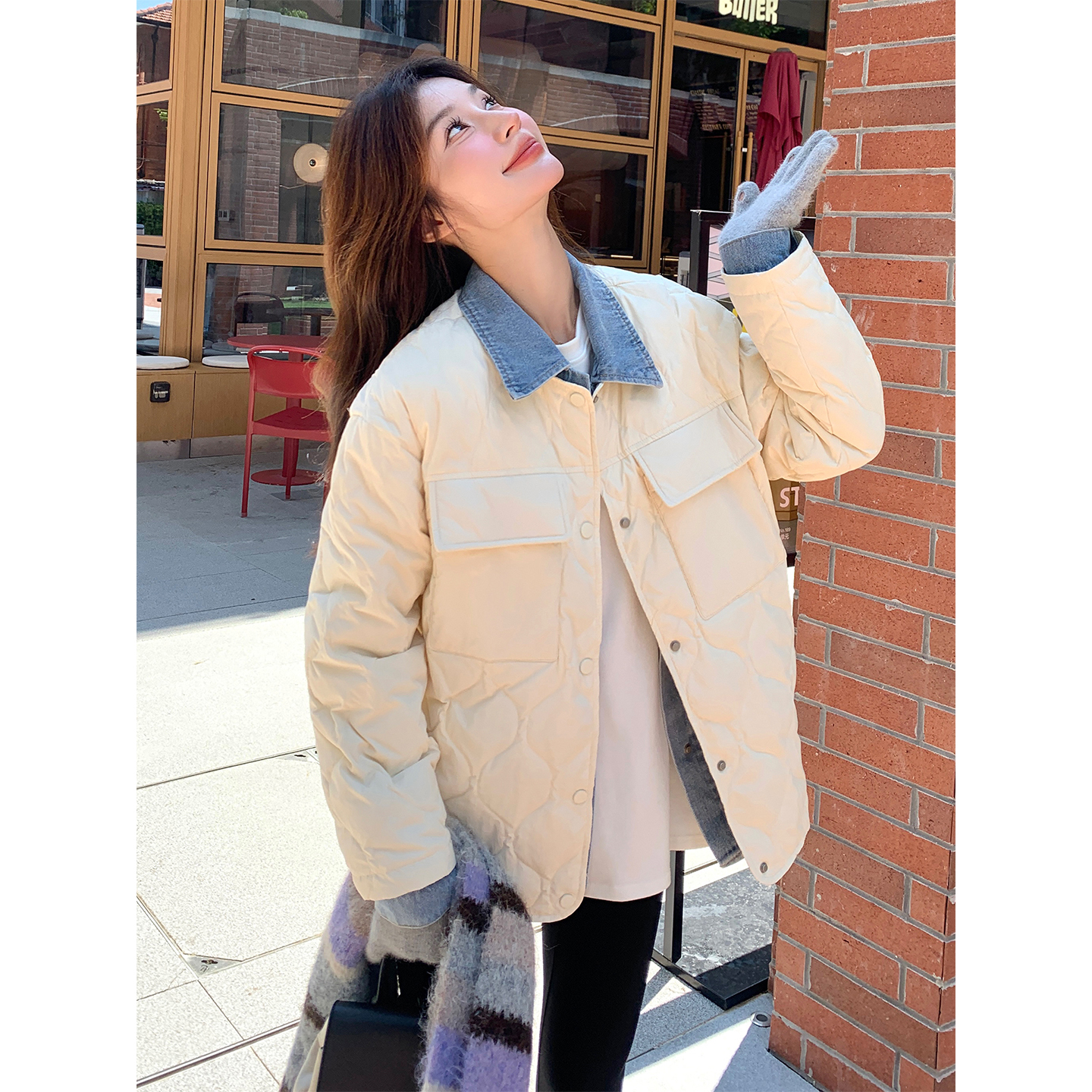 米白色短款假两件牛仔拼接羽绒棉服女冬小众设计轻薄棉衣棉袄外套