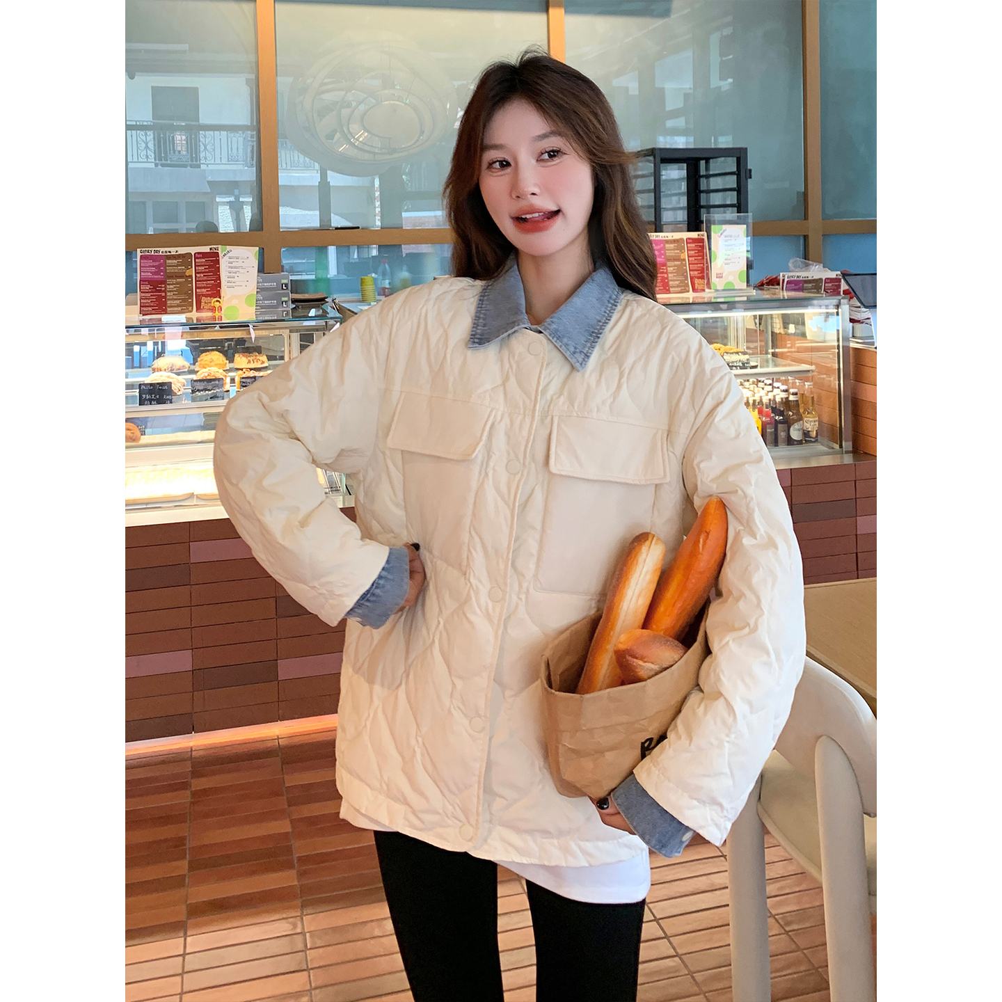 米白色短款假两件牛仔拼接羽绒棉服女冬小众设计轻薄棉衣棉袄外套 - 戳戳CHUOCHUO定制女装