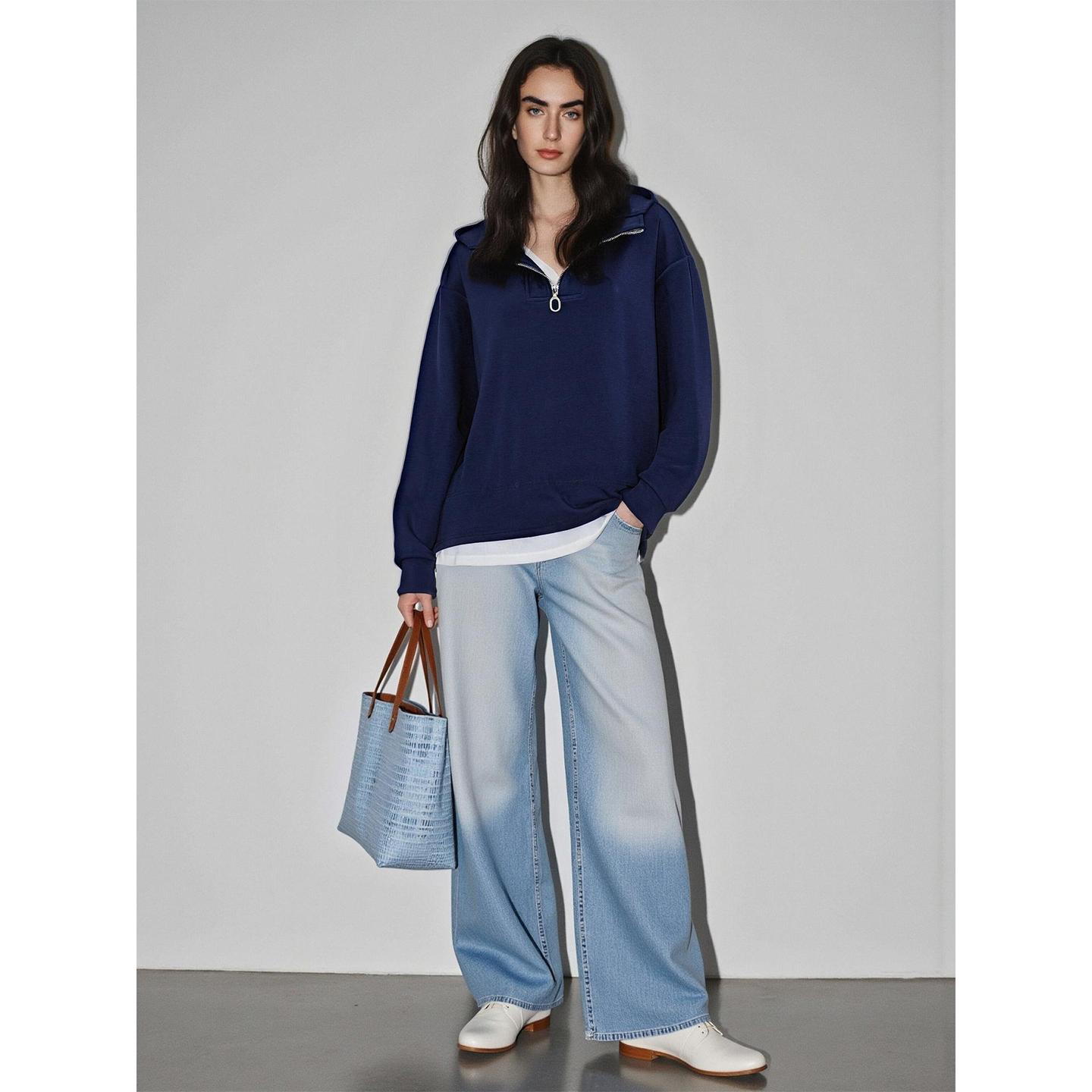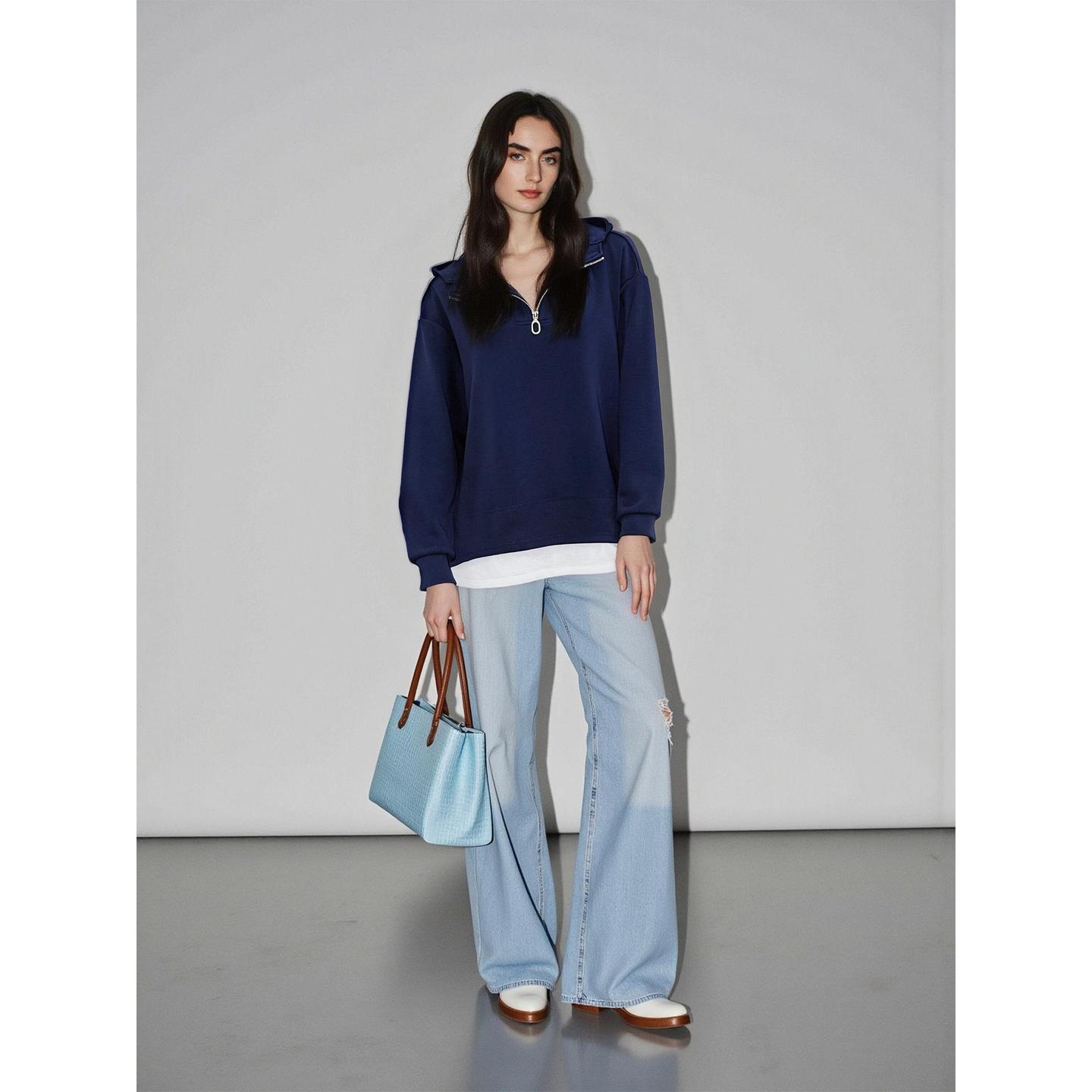 Basic House/百家好假两件半拉链连帽卫衣女秋冬休闲宽松加厚上衣 - BASICHOUSE官方旗舰