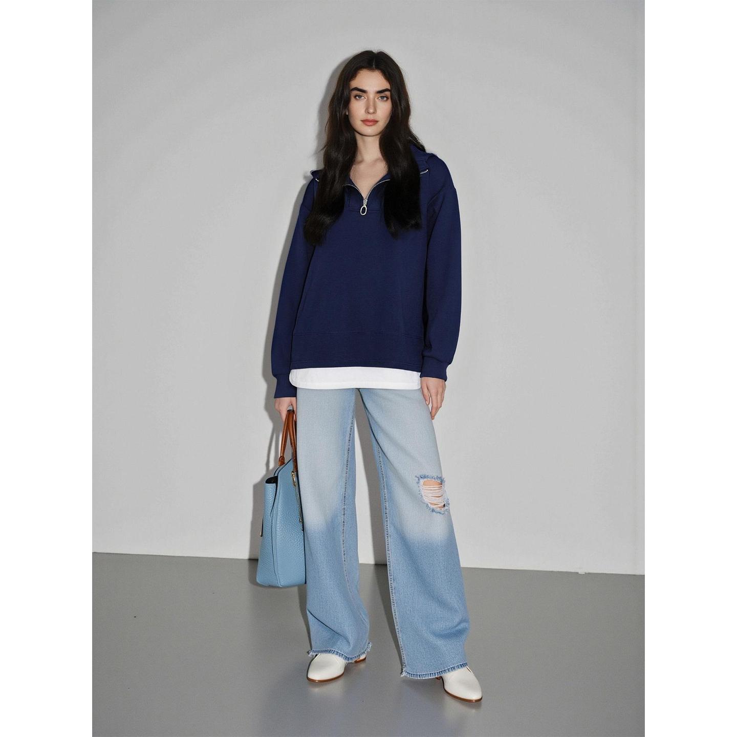 Basic House/百家好假两件半拉链连帽卫衣女秋冬休闲宽松加厚上衣