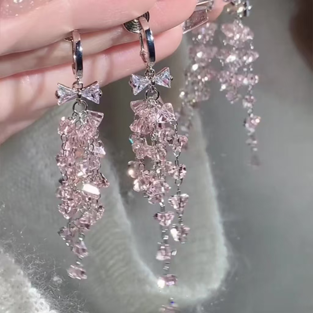 氛围感美女~粉色水晶流苏耳扣氛围感轻奢百搭锆石蝴蝶结耳夹女
