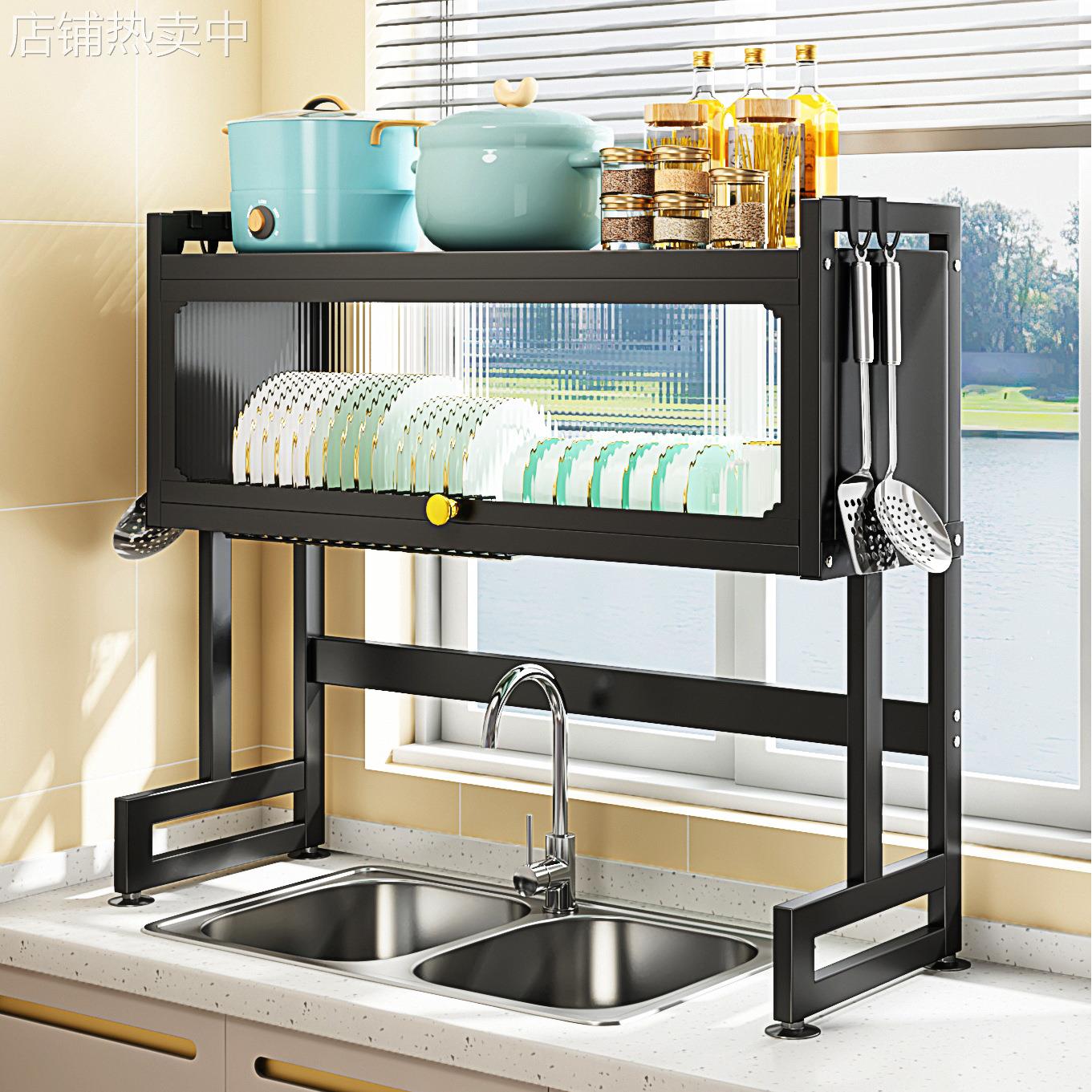 厨房置物架水槽上碗碟收纳架多功能带柜门碗柜沥水架伸缩水池碗架 - 德瑞商贸