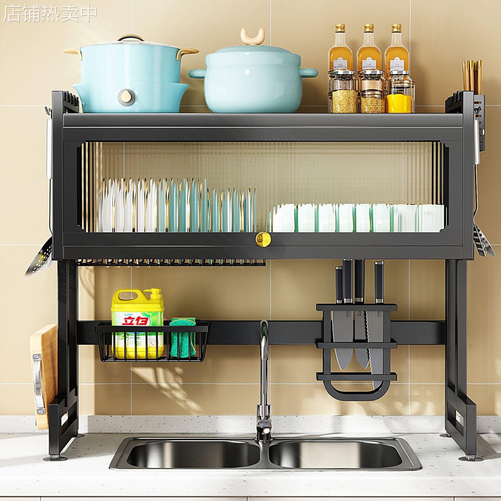 您的位置:他他商城  >   >  厨房置物架水槽上碗碟收纳架多功能带柜门碗柜沥水架伸缩水池碗架