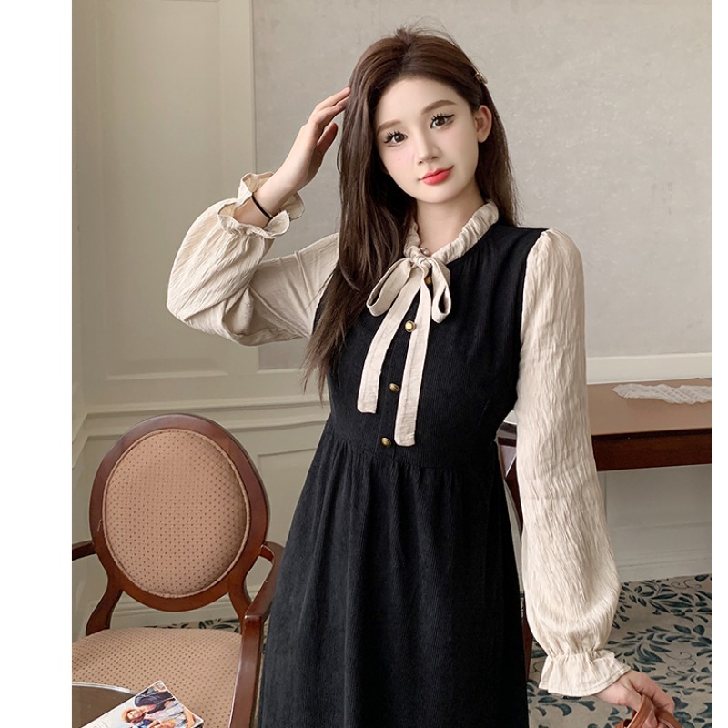 150cm小个子法式复古假两件拼接系带连衣裙收腰显瘦灯芯绒长裙xs - 阿华家小个子女装