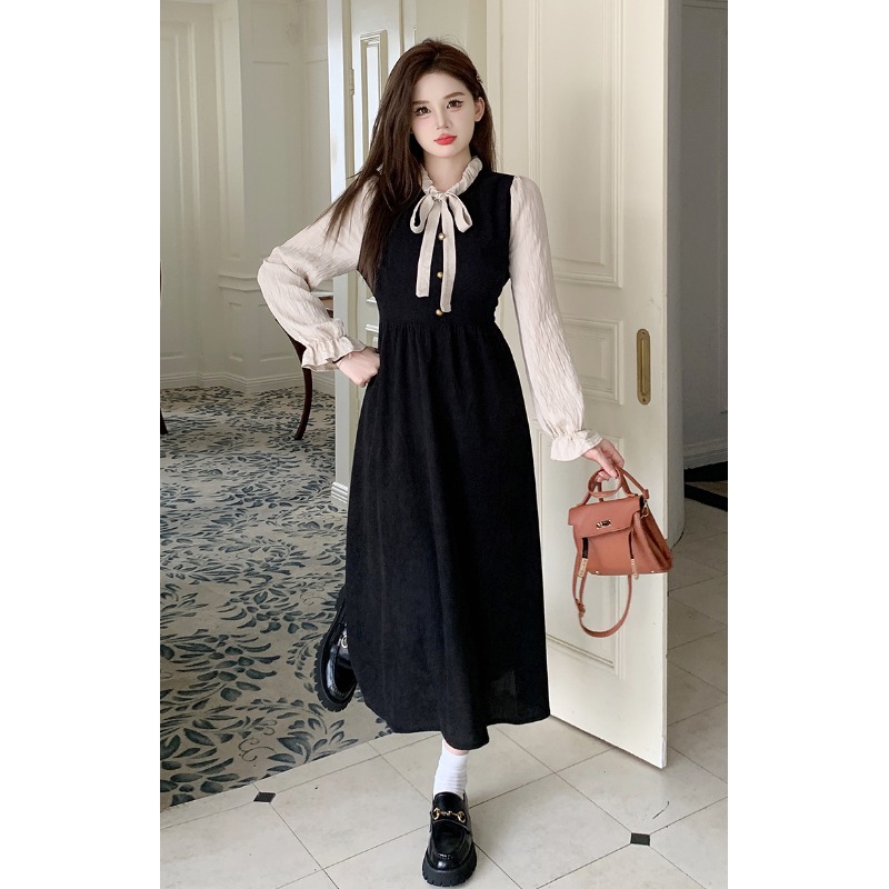 150cm小个子法式复古假两件拼接系带连衣裙收腰显瘦灯芯绒长裙xs