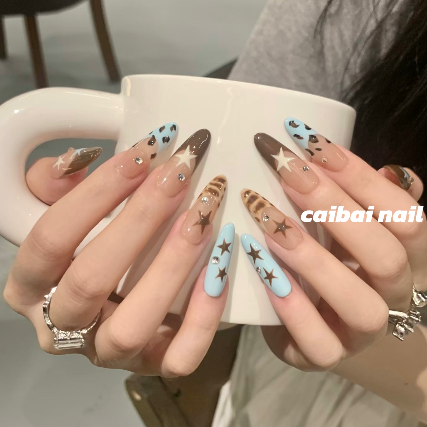 【星野棕蓝】秋冬美甲棕蓝撞色星星元素豹纹点玳瑁纹理水钻穿戴甲 - 采白家手工穿戴甲