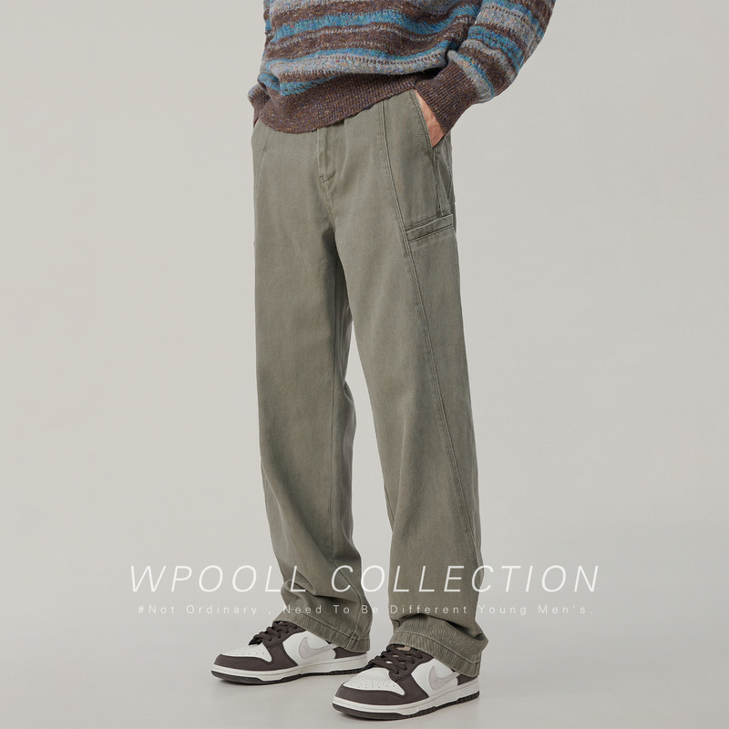 美式解构设计绿色全棉工装裤男秋季新款潮牌宽松直筒伐木休闲裤男 - 逆行部落