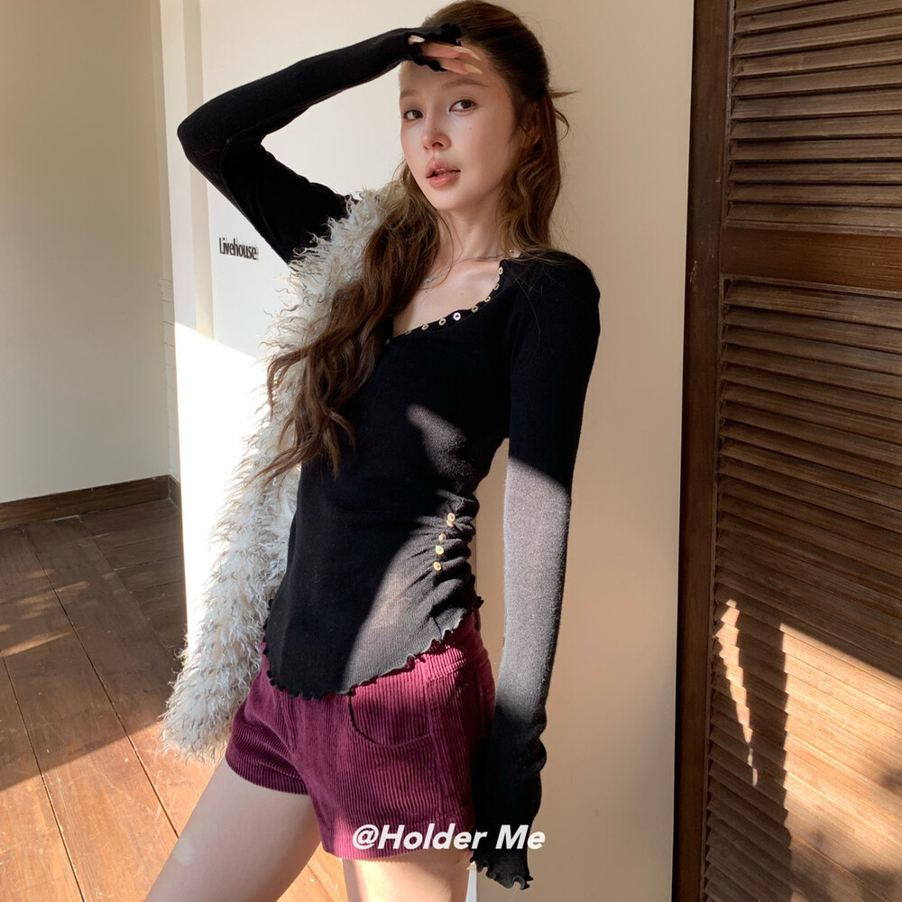 HOLDER韩系2025冬季新款V领显瘦百搭贝壳扣保暖木耳边长袖毛衣女 - BIack Grape批发女装