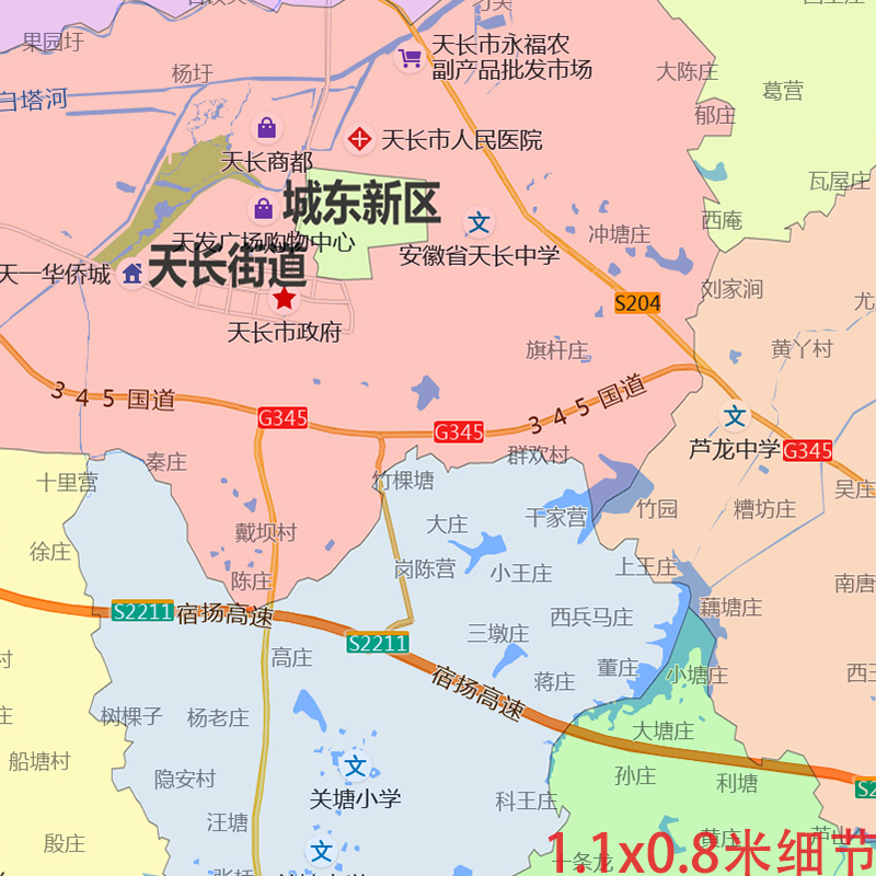 天长市地图1.1米全图定制安徽省滁州市行政区域颜色划分贴图新款
