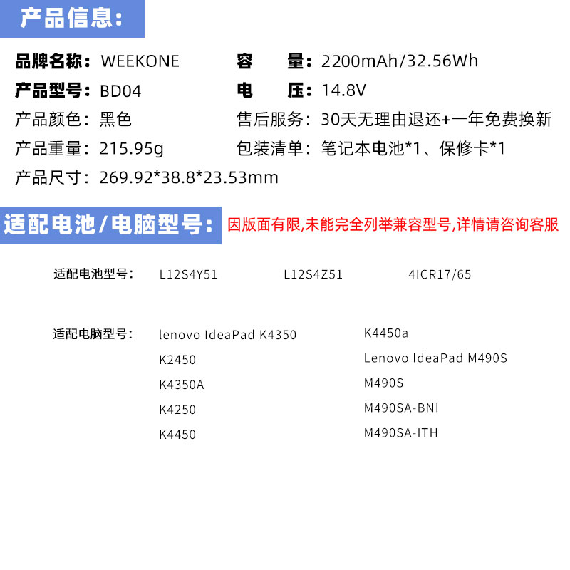 联想K2450 K4350A K4250 K4450 K4450a M490S M490SA-BNI M4400S B4450S B4400S B4400sa B490s笔记本电池 - WEEKONE旗舰店