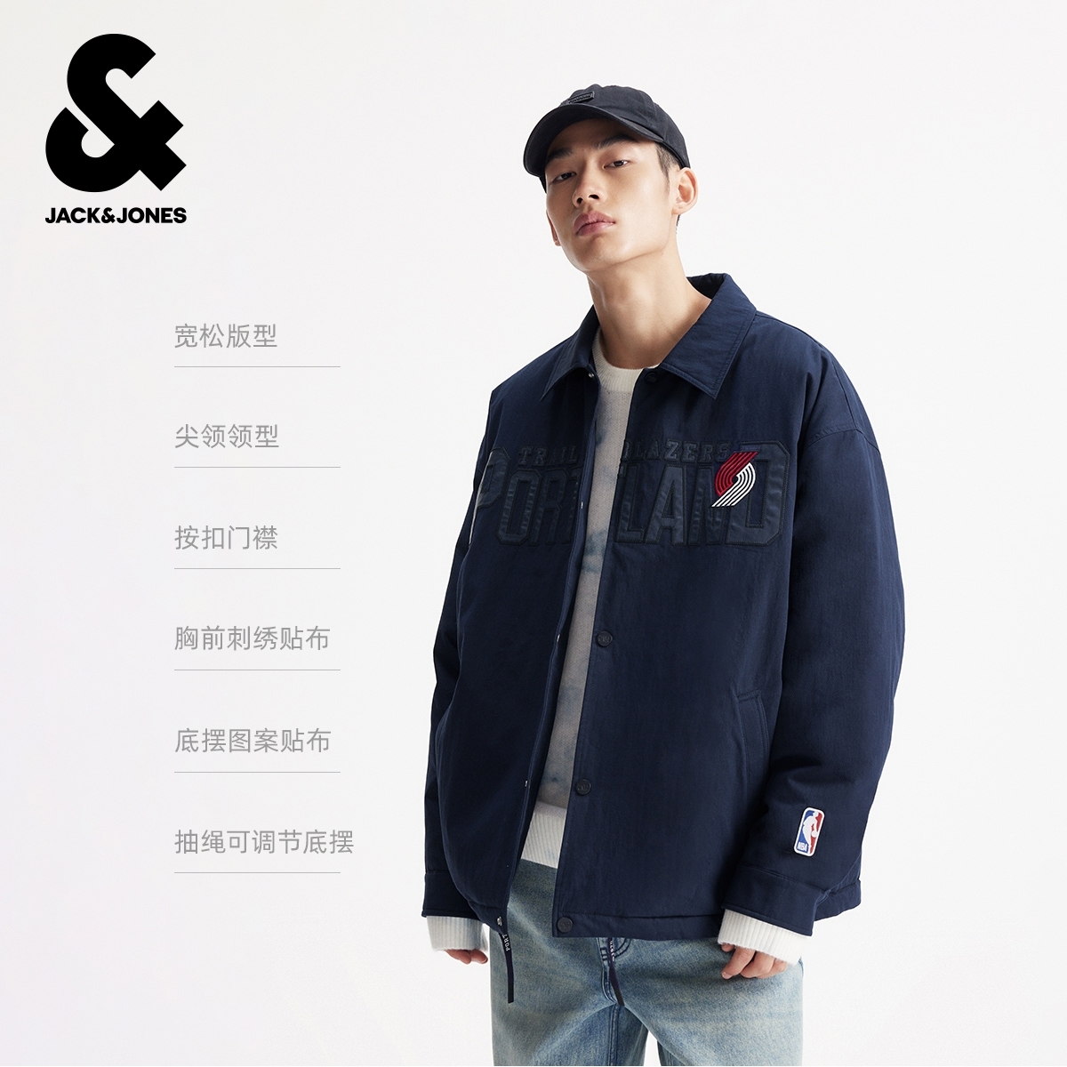 杰克琼斯NBA联名波特兰开拓者球队男装羽绒服冬季新款翻领外套