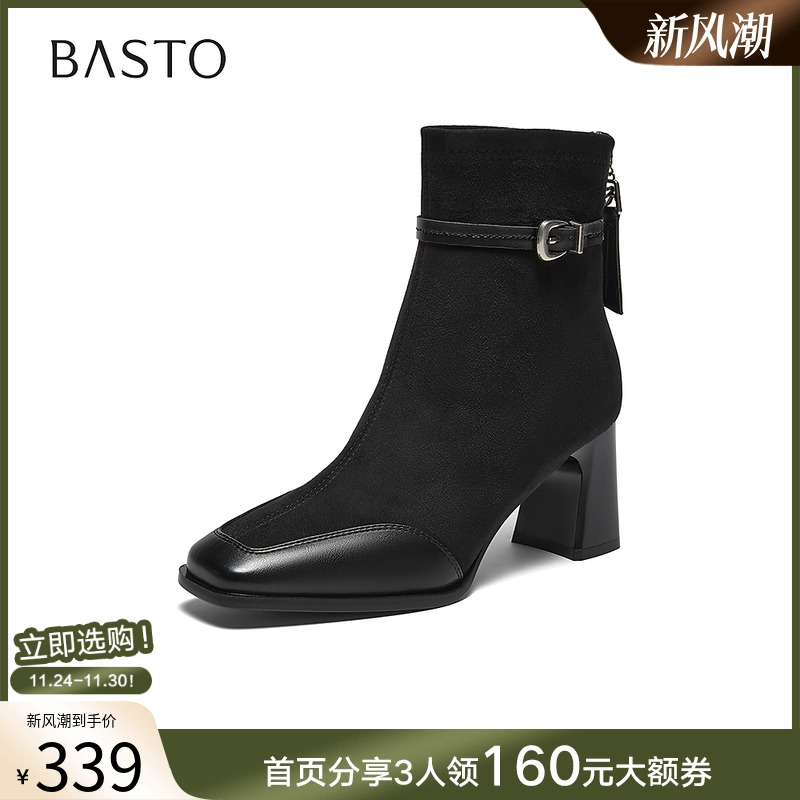 百思图2025冬季商场新款粗高跟法式女短靴绒面拼接马丁靴F2178DD5 - 百思图官方旗舰店
