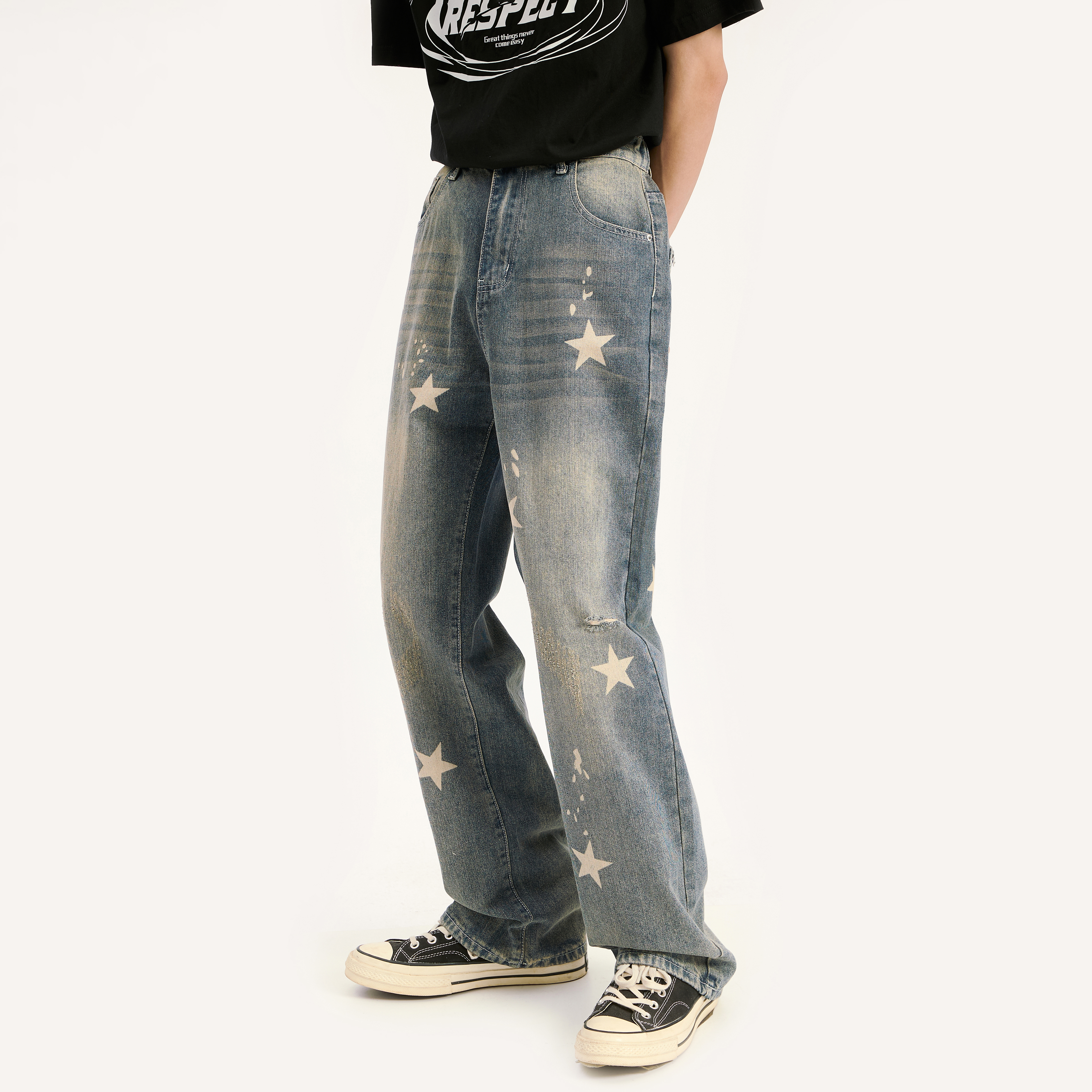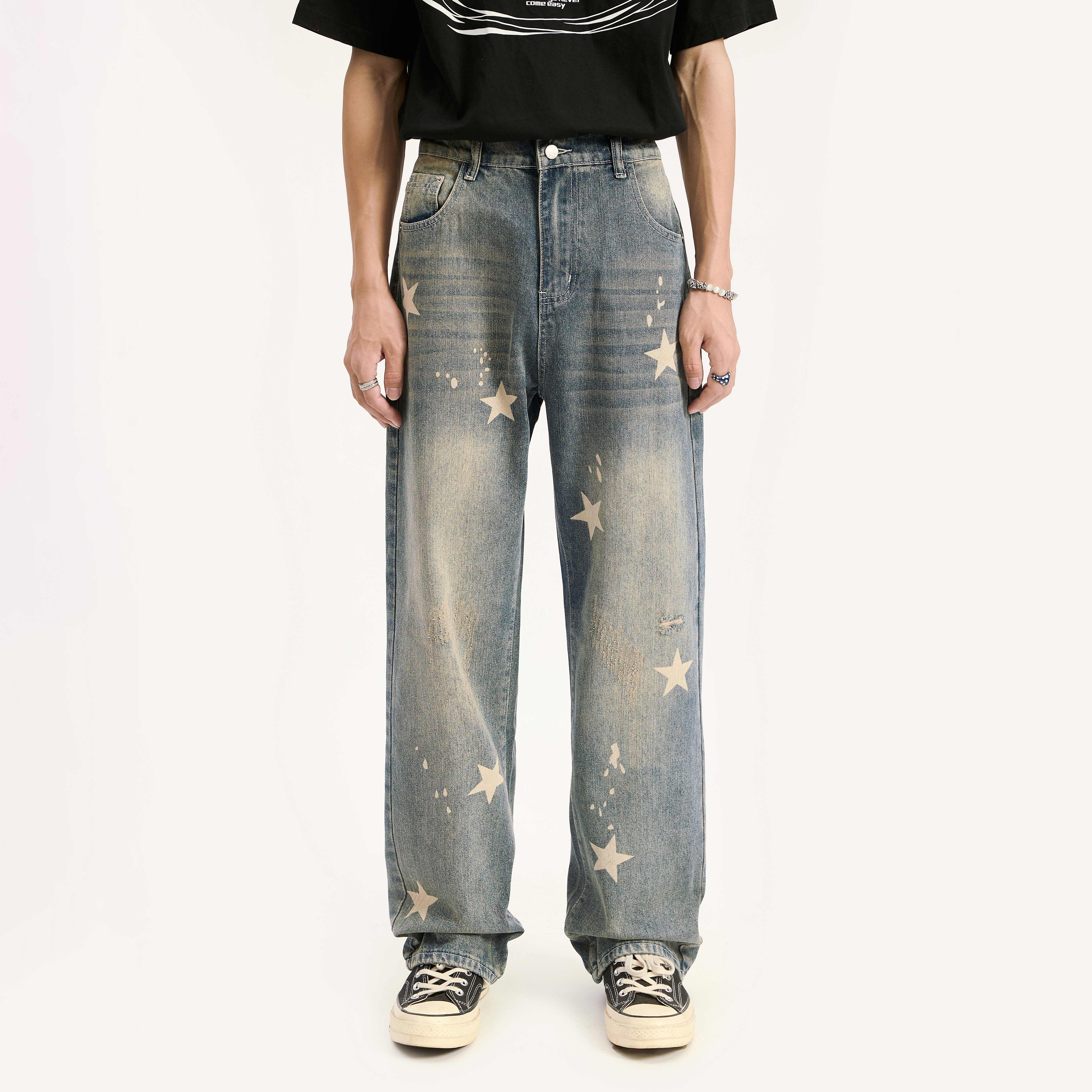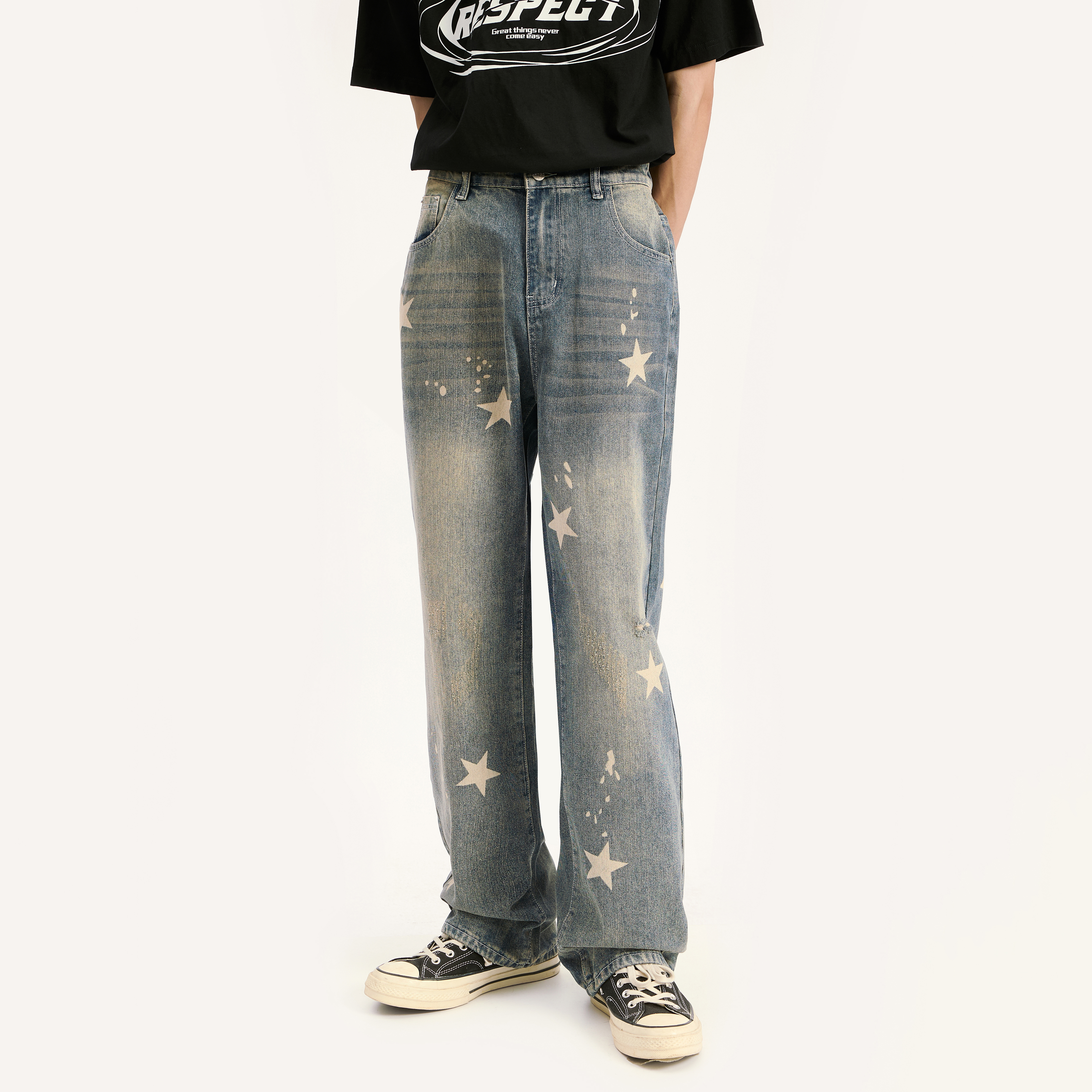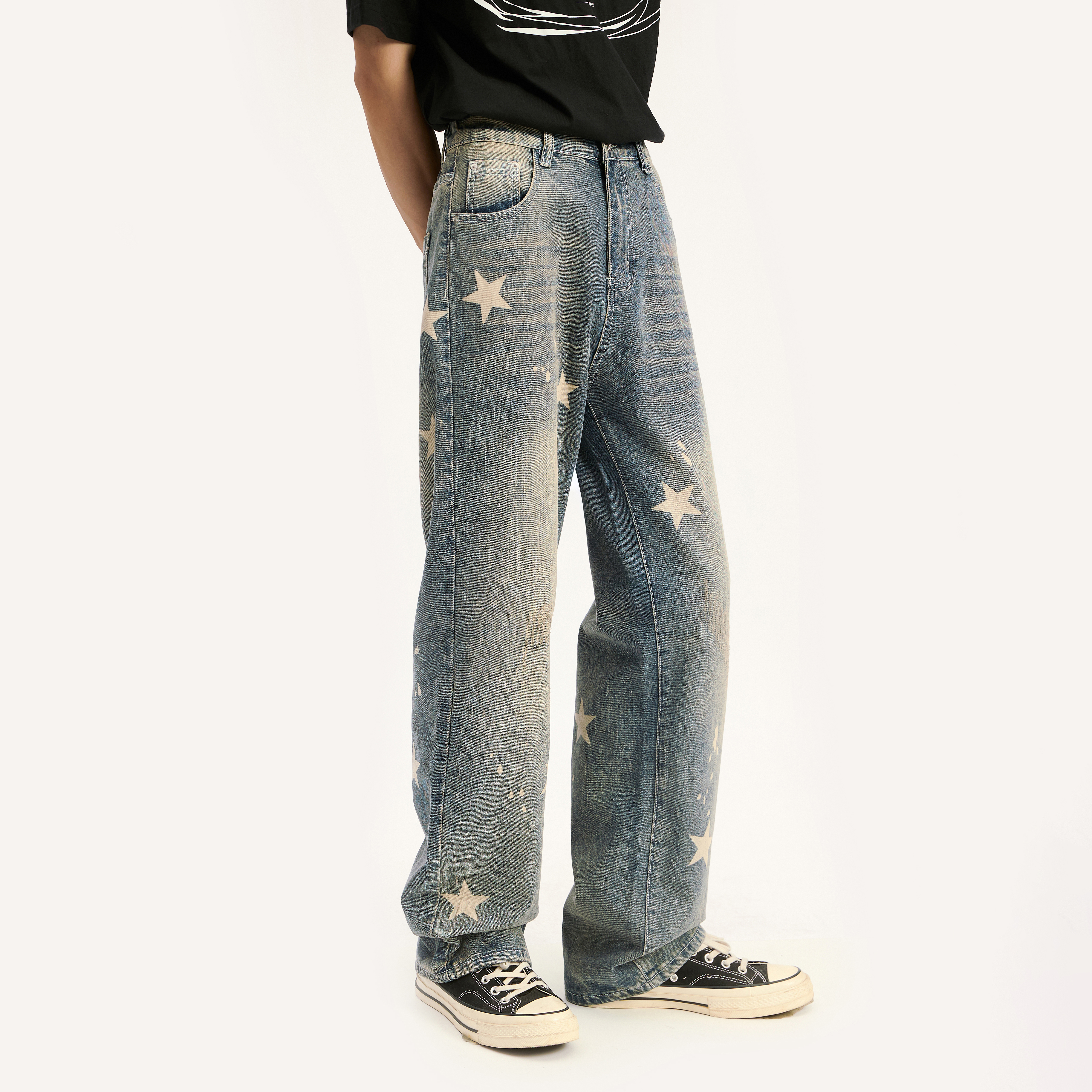 Voguo Relay 复古迷彩星星印花宽松直筒小众设计牛仔裤男女同款 - Voguo Relay 中国