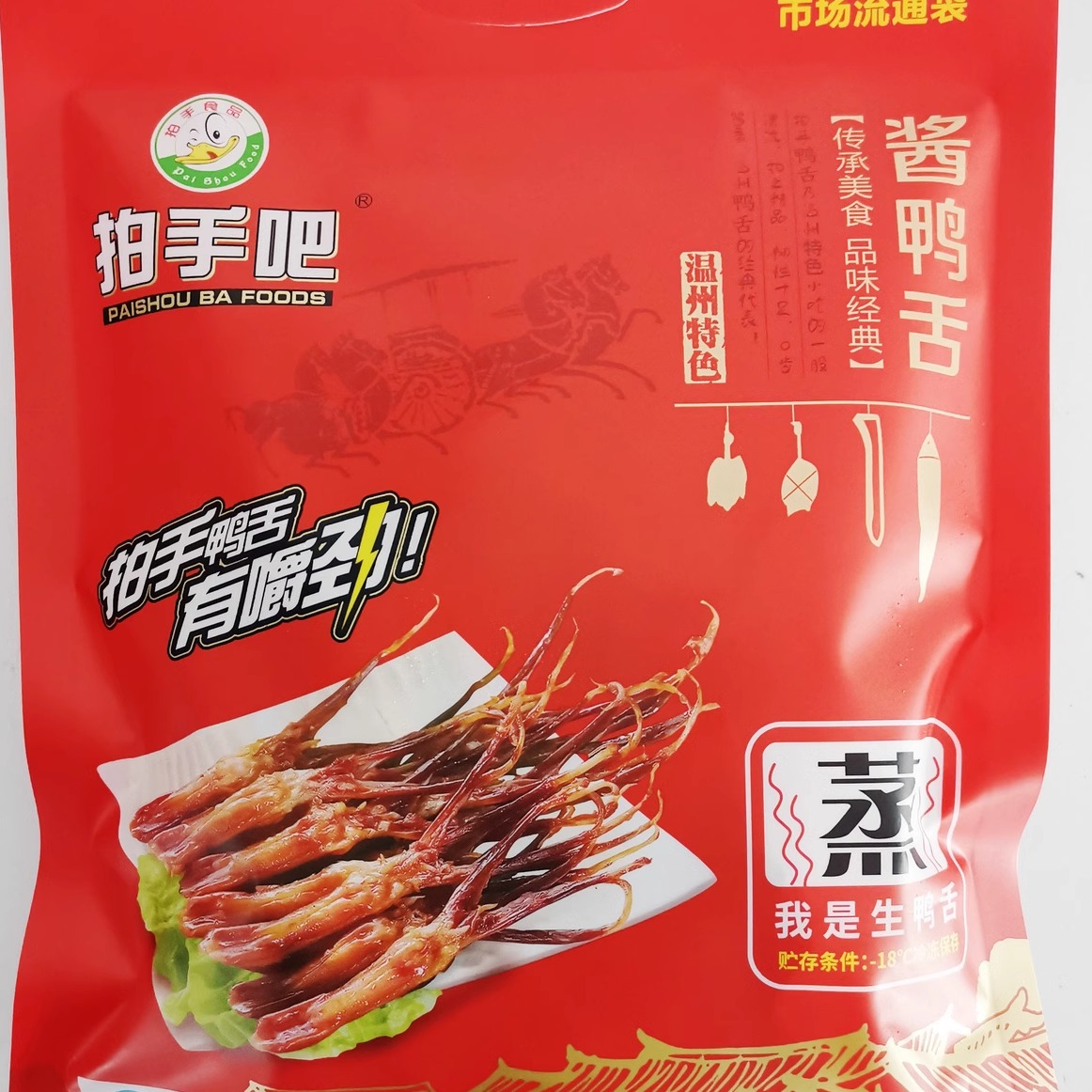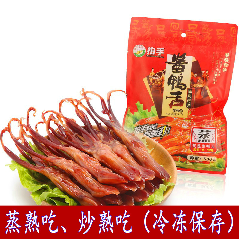 您的位置:他他商城  >   >  温州特产酱鸭舌大条拍手生鸭舌头含袋500g酒席冷盘小吃下酒菜年货