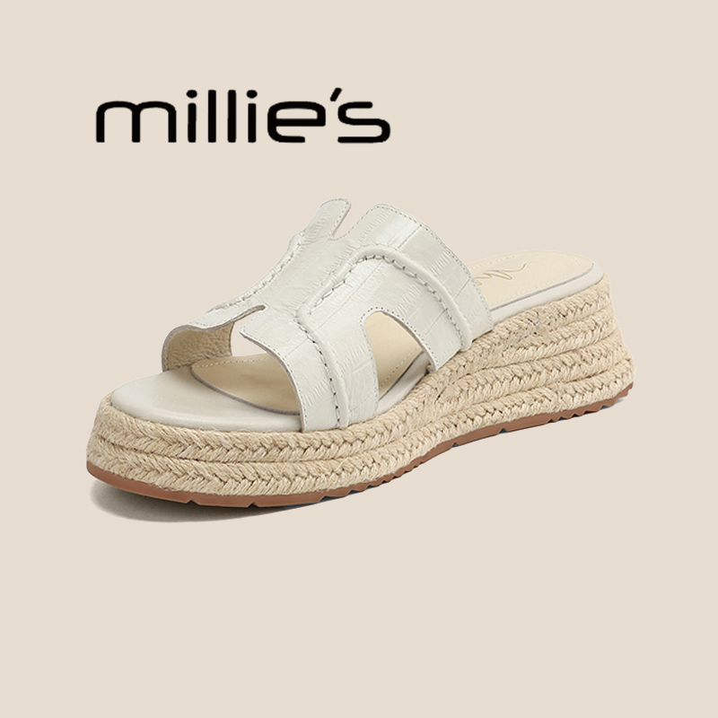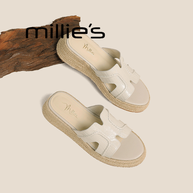 MILLIE'S/妙丽露趾一字拖鞋女夏外穿厚底增高凉拖草编渔夫半拖夏 - MILLIES妙丽嵩正专卖店