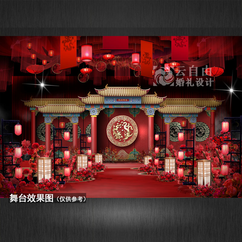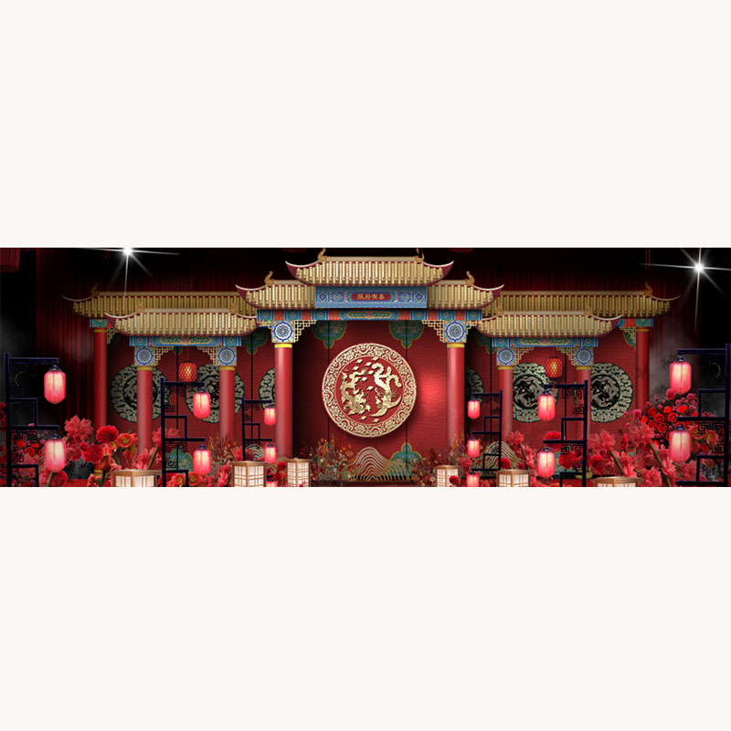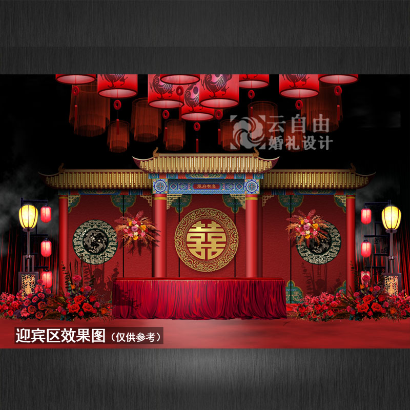 红色明制中式婚礼效果图龙凤婚庆舞台背景KT板喷绘设计PSD素材 - 云自由设计传媒