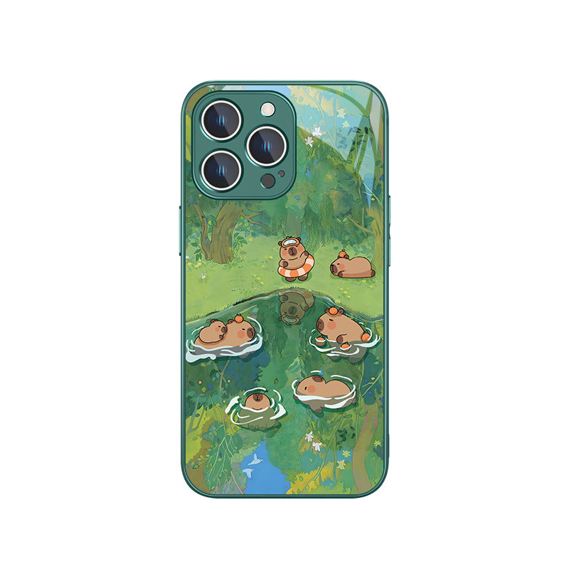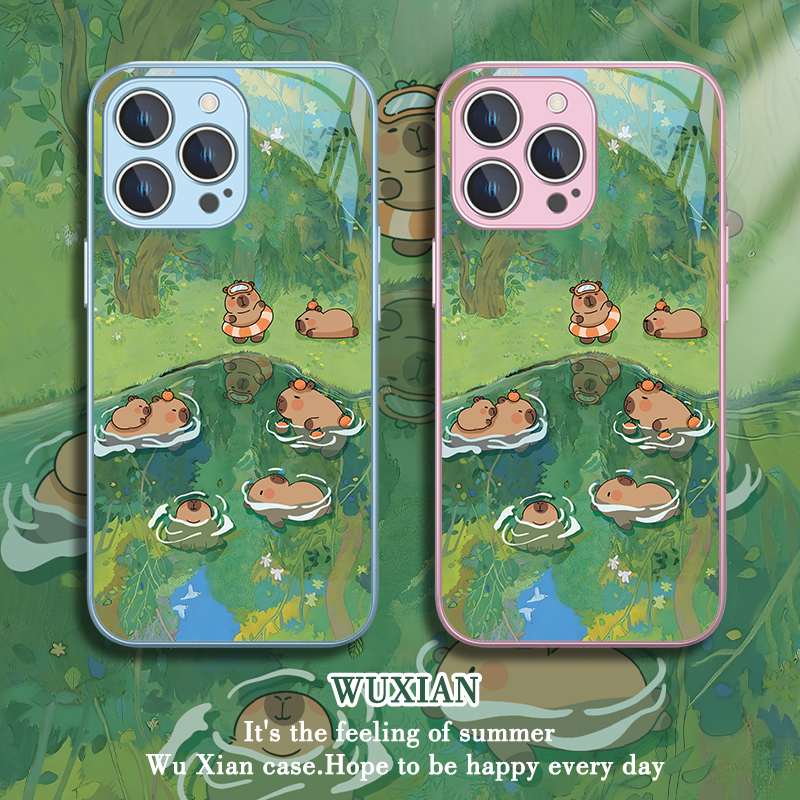 适用iphone15pro手机保护壳16夏天游泳水豚苹 果14新款13promax小清新12mini卡皮巴拉11绿色xsmax/xr女x玻璃8 - 萌趣数码宝盒
