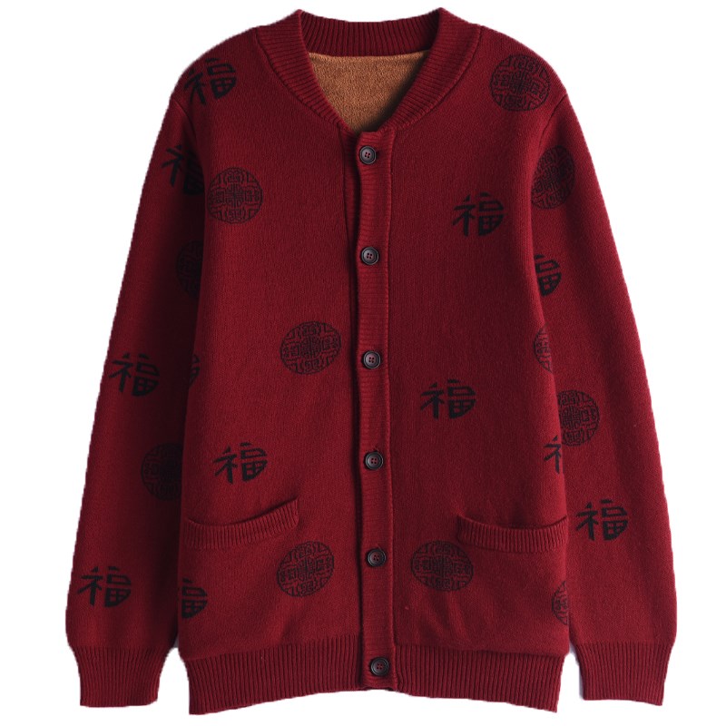 中老年羊毛开衫加绒加厚红色喜庆爸爸妈妈针织毛衣本命年外套新款 - 语亚工厂