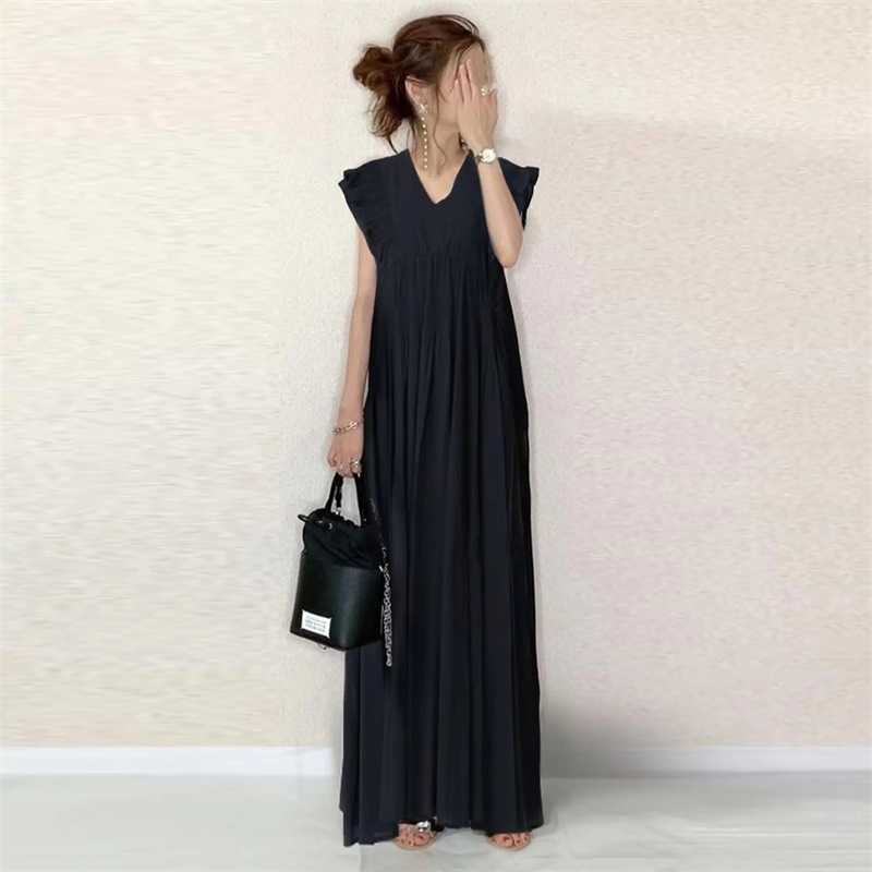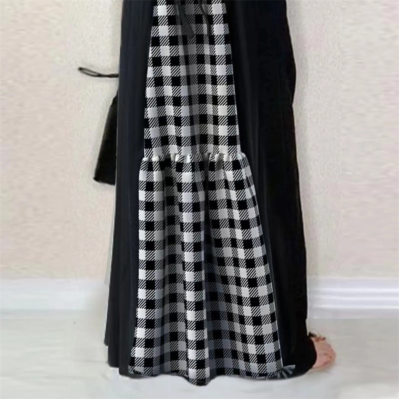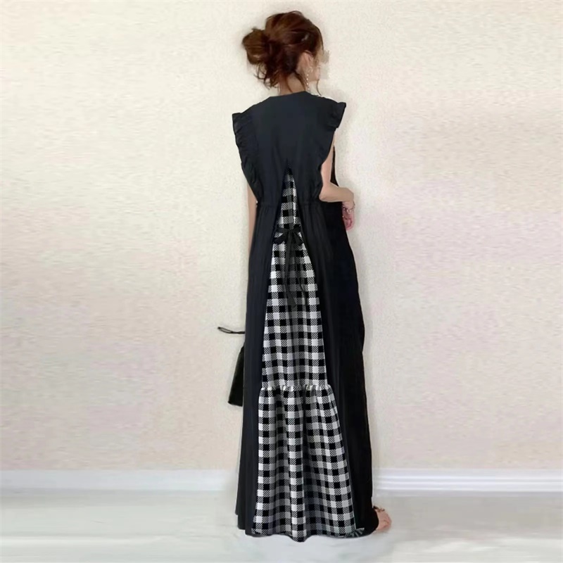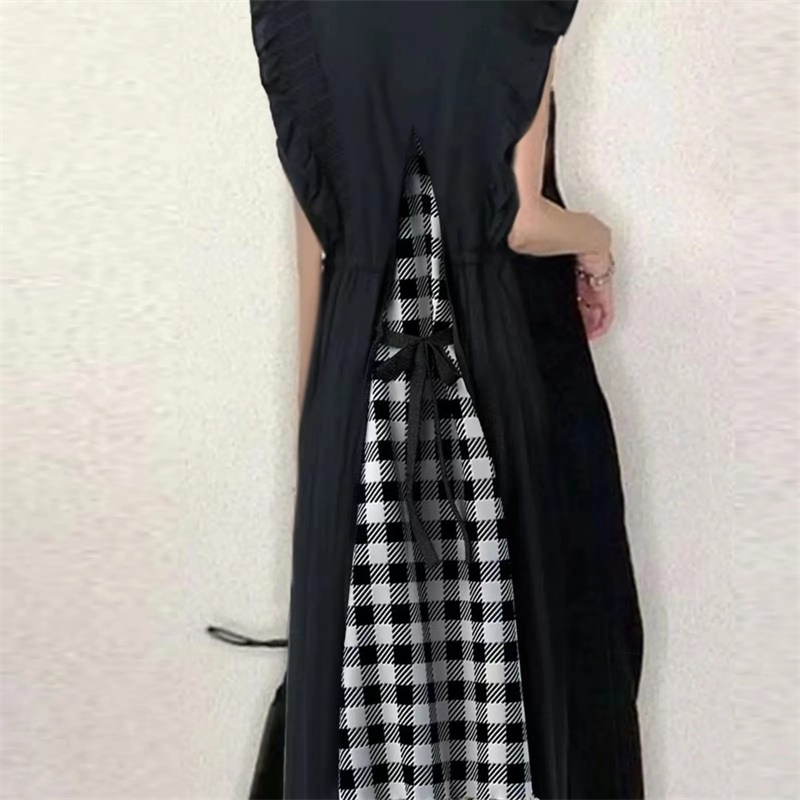 Checked patchwork dress 后背绑带格子拼接木耳边袖口V领连衣裙