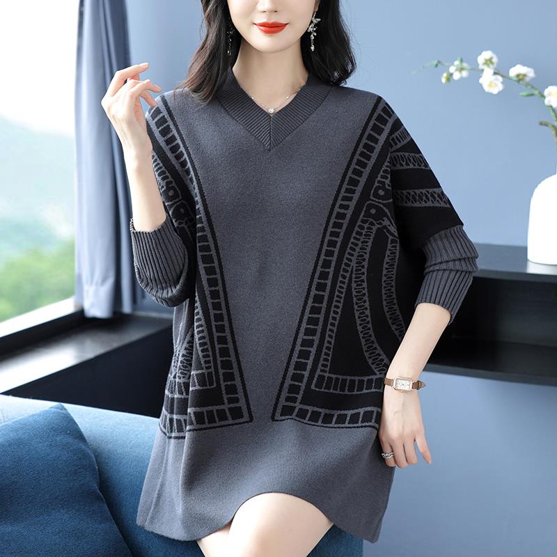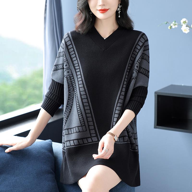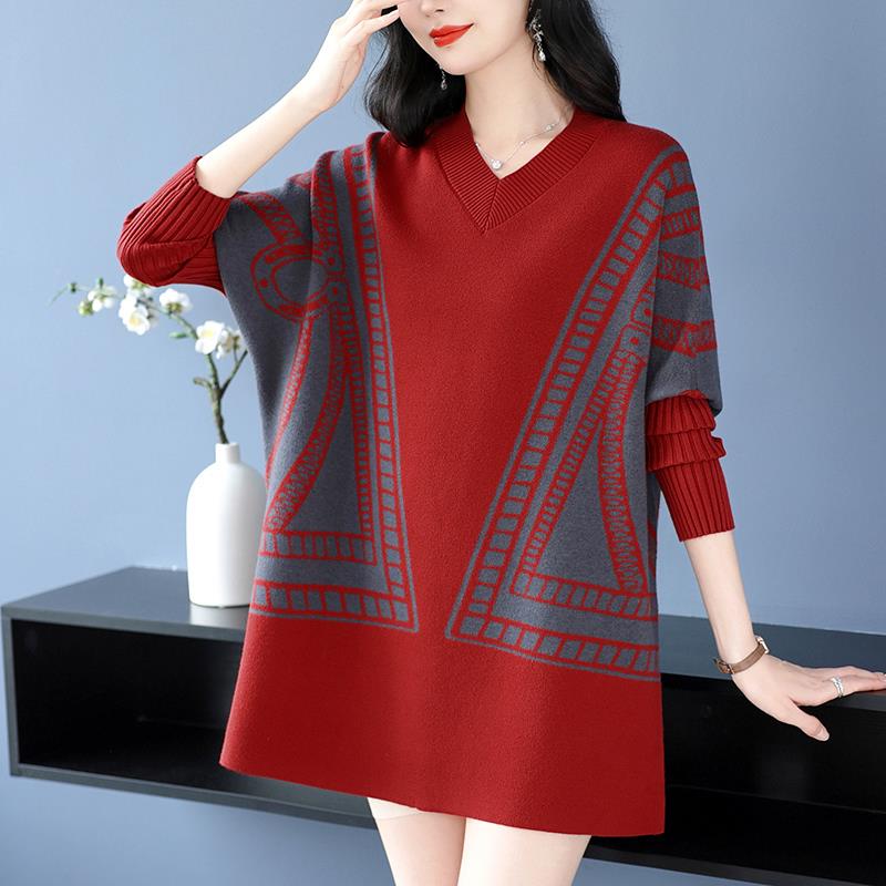 胖妈妈羊绒衫V领中长款毛衣女秋冬洋气蝙蝠衫加肥大码羊毛打底衫 - 大码女装直销店