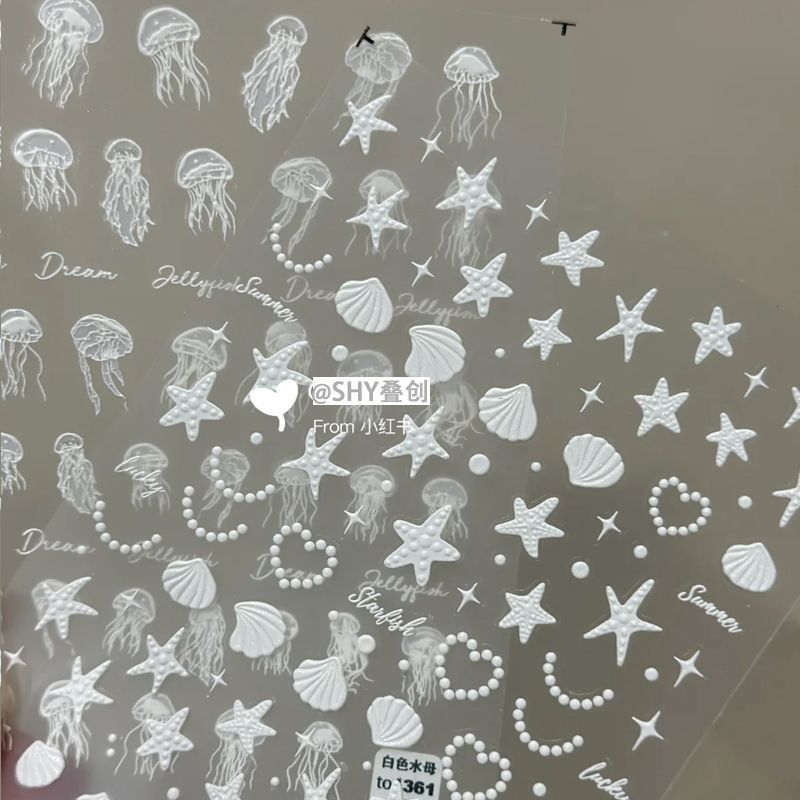 小红书新款美甲贴纸白色简约水母海星海洋贝壳浮雕立体ins装饰贴 - 醒在山河Stickers