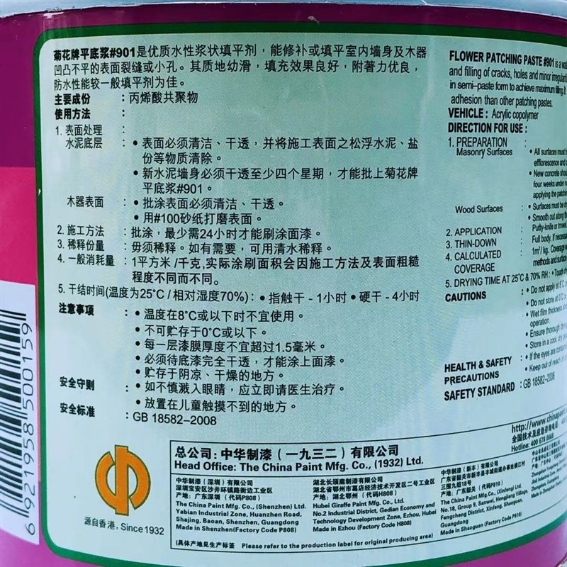 中华制漆菊花牌平底浆木器墙面凹凸裂缝水性浆状填平修补剂补墙膏 - 秋肥永丰商城