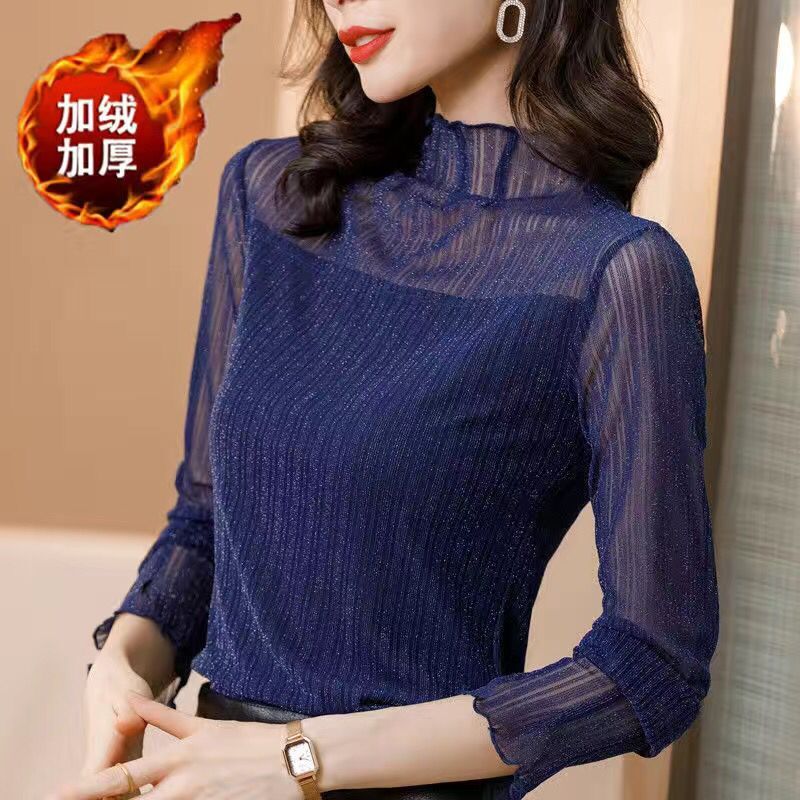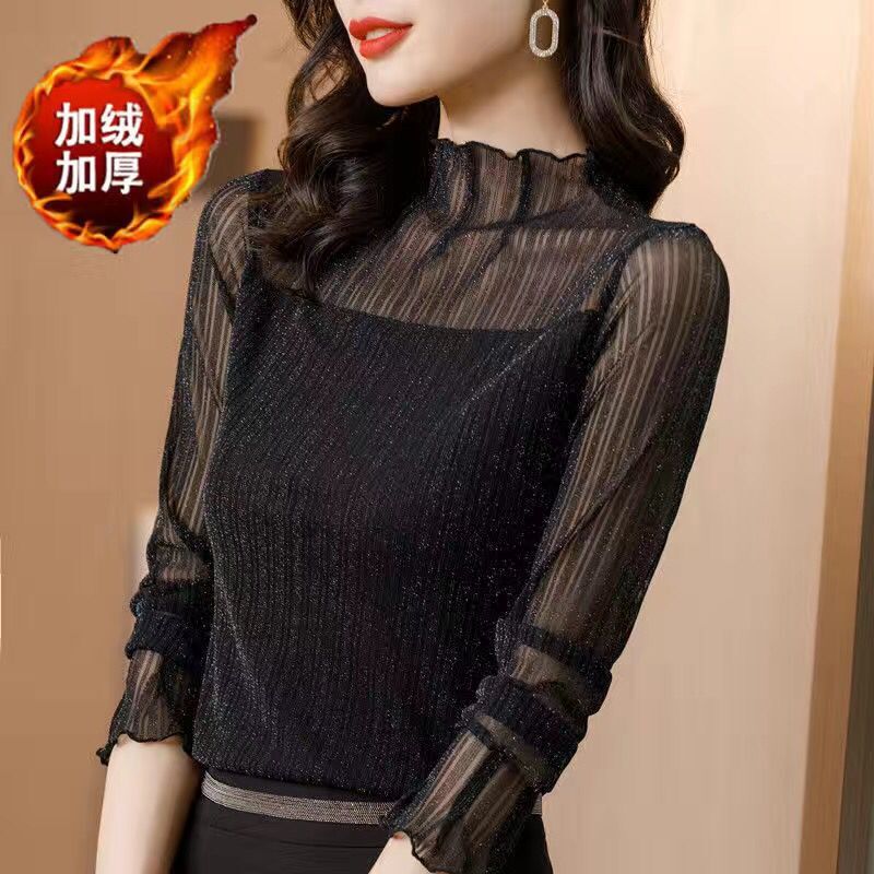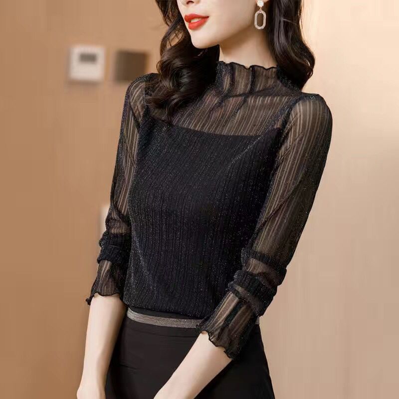 【赠运费险】半高领网纱长袖打底衫女春秋大码显瘦亮丝t恤上衣冬 - 婷婷家实拍女装店