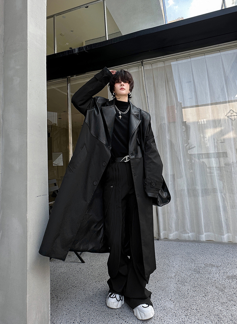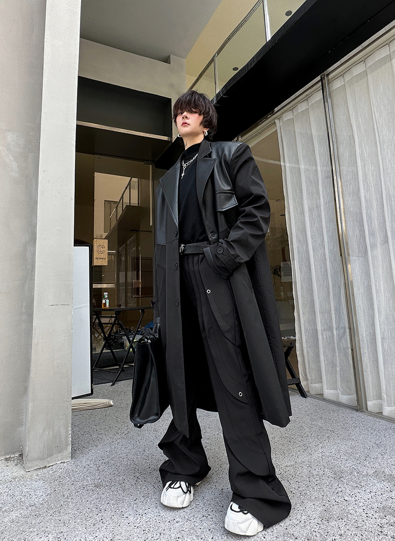 秋冬小众解构PU皮拼接设计风衣男韩版单排扣长款过膝痞帅大衣外套 - 我爱文艺美型男