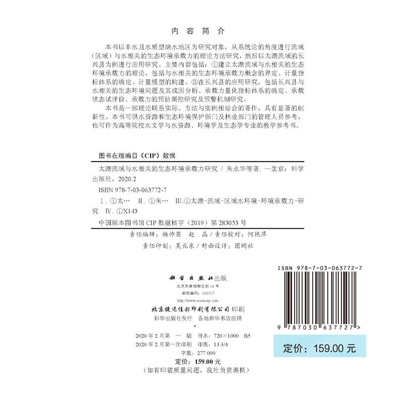 正版现货 太湖流域与水相关的生态环境承载力研究 朱永华等 科学出版社 - 国家图书馆出版社图书专营