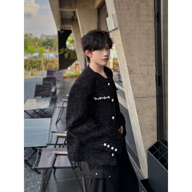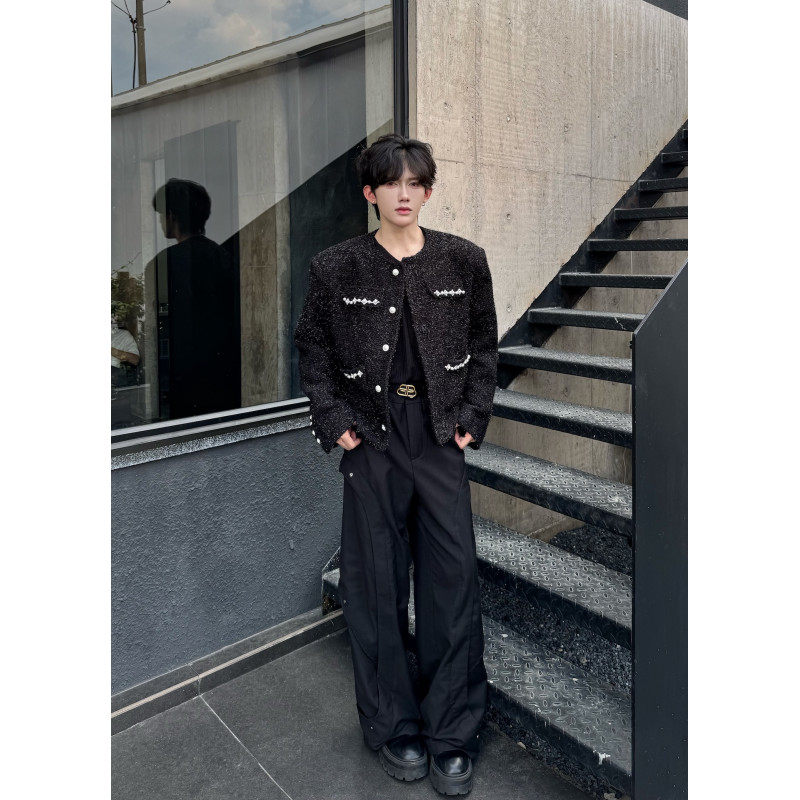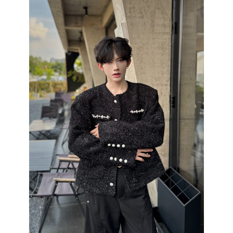 轻奢高级感短款垫肩小香风珍珠无领西装外套男粗花呢男模穿搭夹克 - 我爱文艺美型男