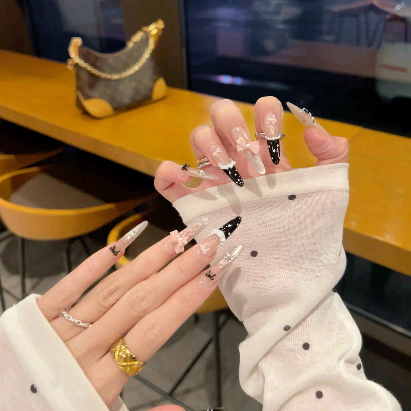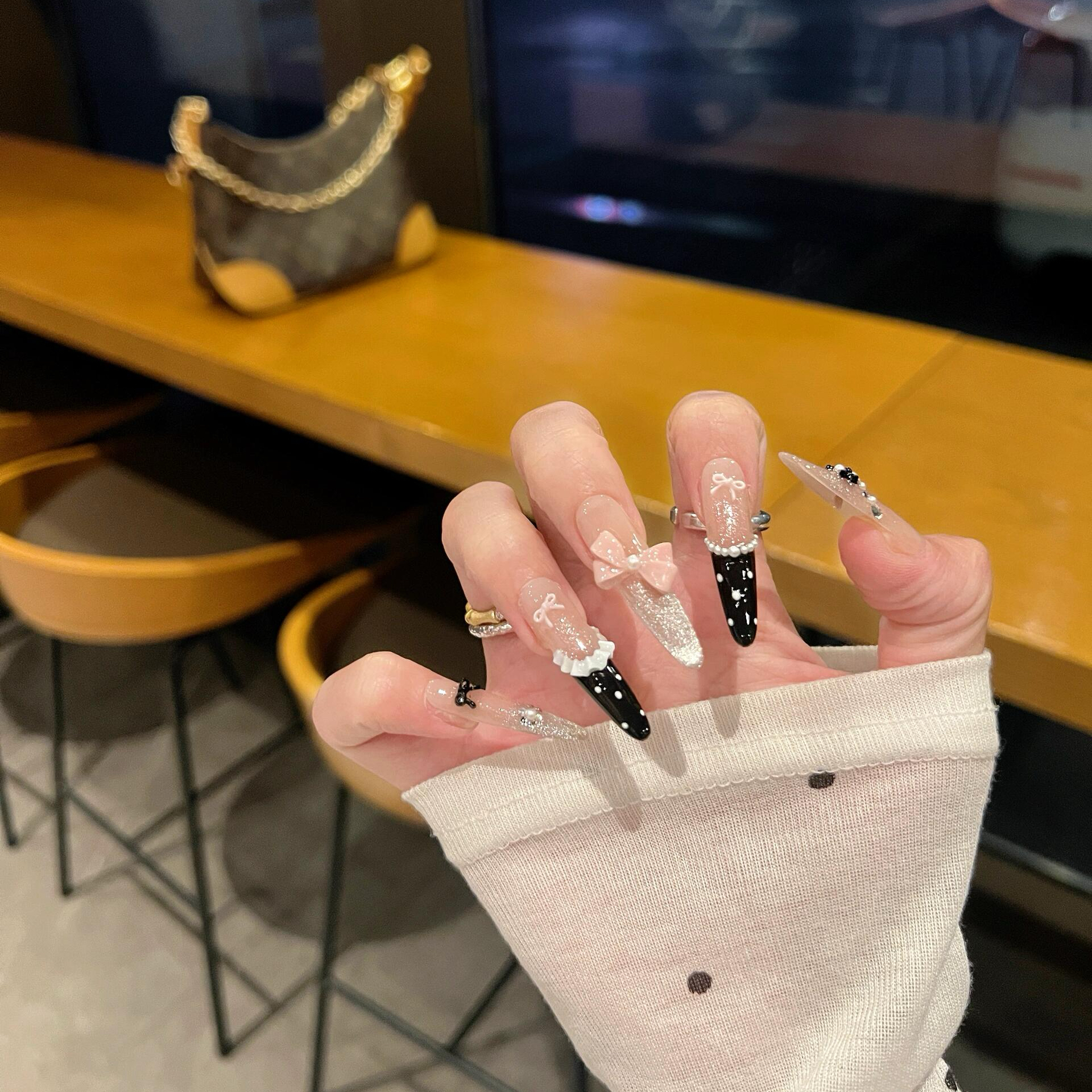 您的位置:他他商城  >   >  【公主城堡】Vivian奶油粉色雕花蝴蝶结黑色法式手工穿戴甲J243款