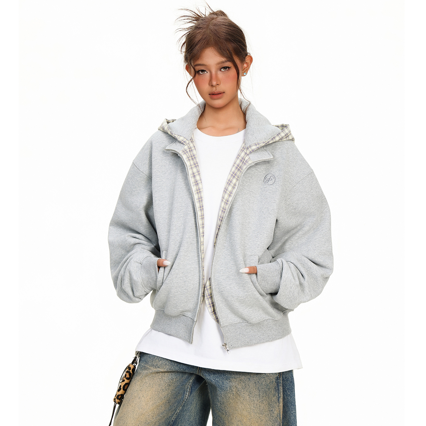 FORUYES官方店 秋冬季圆环字母格纹内衬修身拉链帽衫开衫加绒外套 - FORUYES
