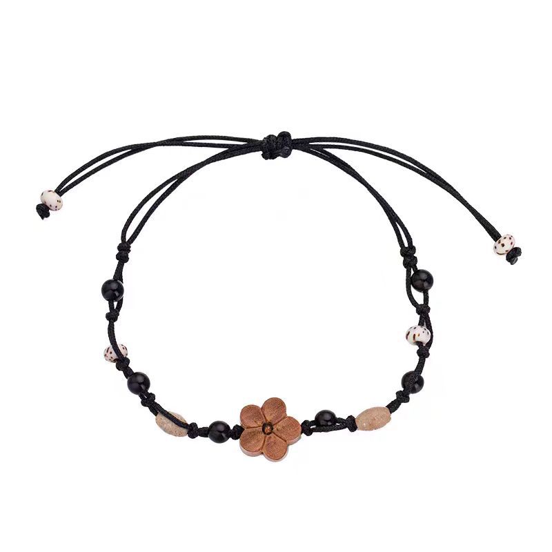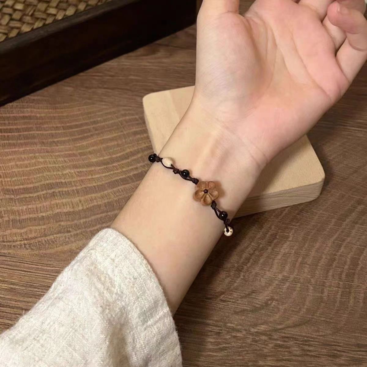 新中式复古木雕刻小桃花手链女桃木编织手绳小众设计百搭国潮 - 碎碎星