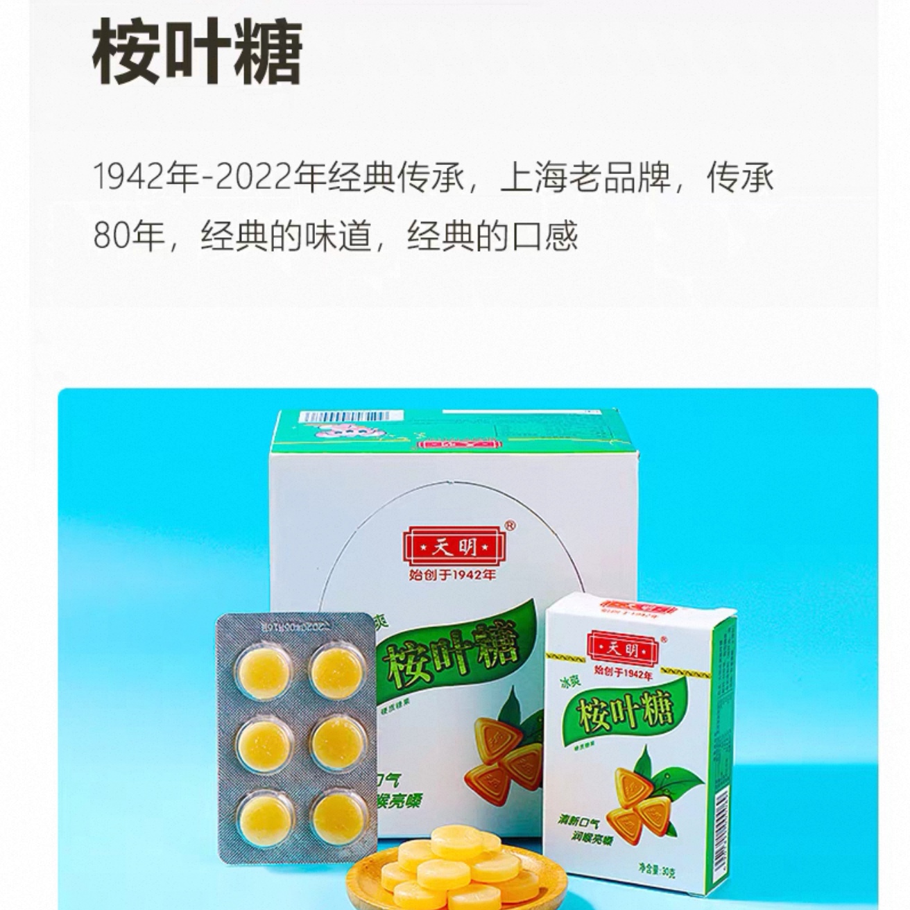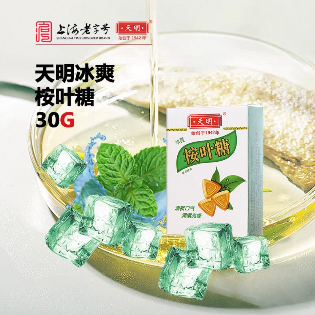 天明桉叶糖30g盒冰爽薄荷糖清新口气润喉亮嗓上海老字号糖果
