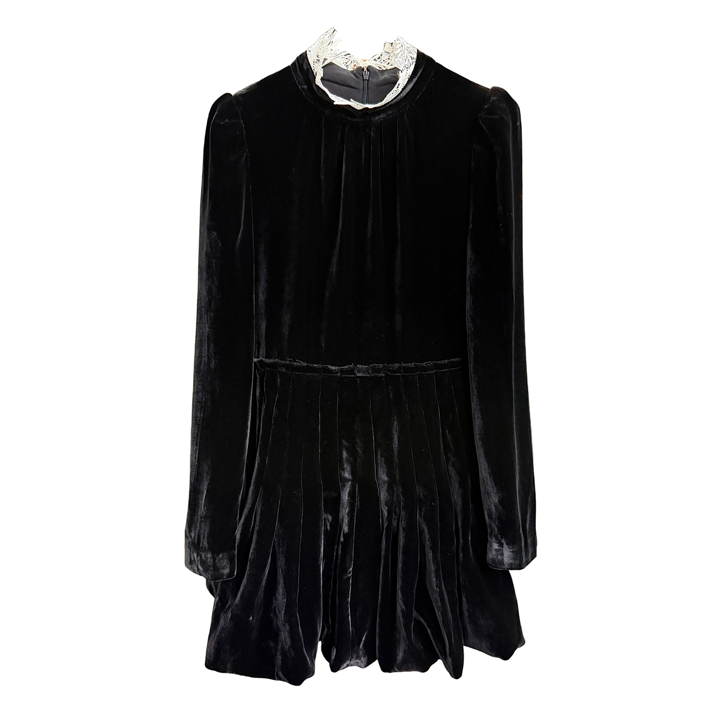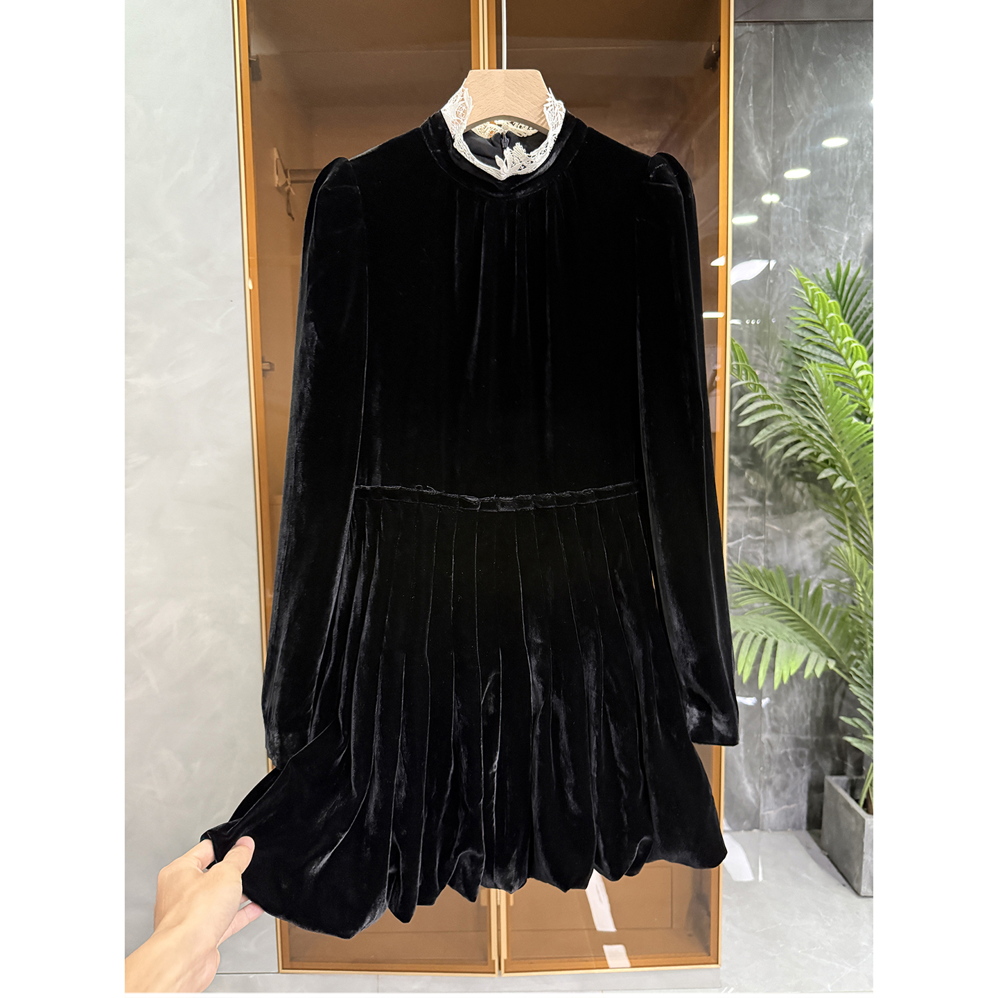 美出片!浪漫法式!真丝丝绒拼花边立领百褶连衣裙 20234697~JS - 锐雪加