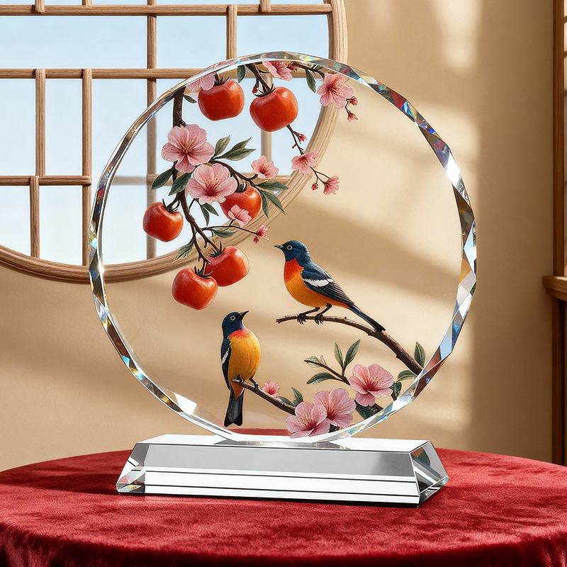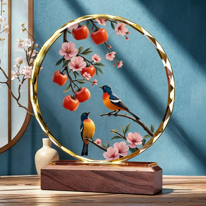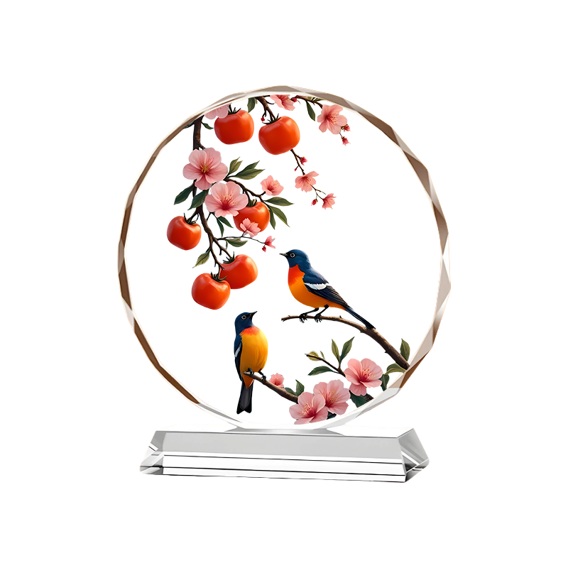 双喜临门水晶摆件柿子喜鹊高档装饰桌面摆台家居乔迁礼物定制摆台 - 财韵晶坊