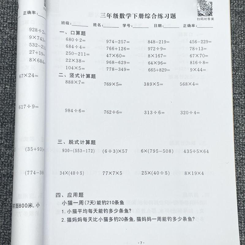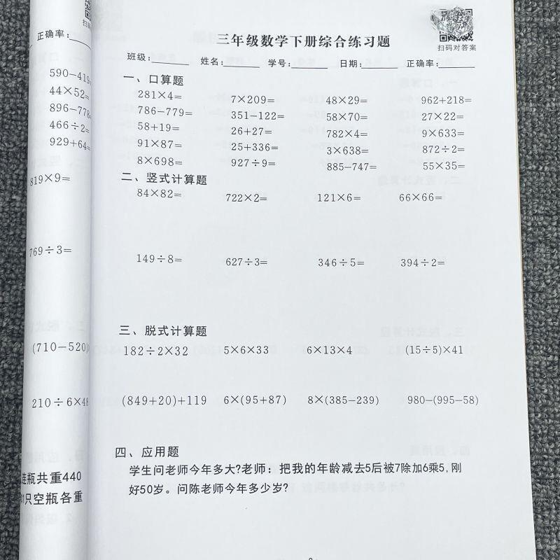 三年级上下册口算竖式脱式解方程小数加减乘除混合练习本课业本子