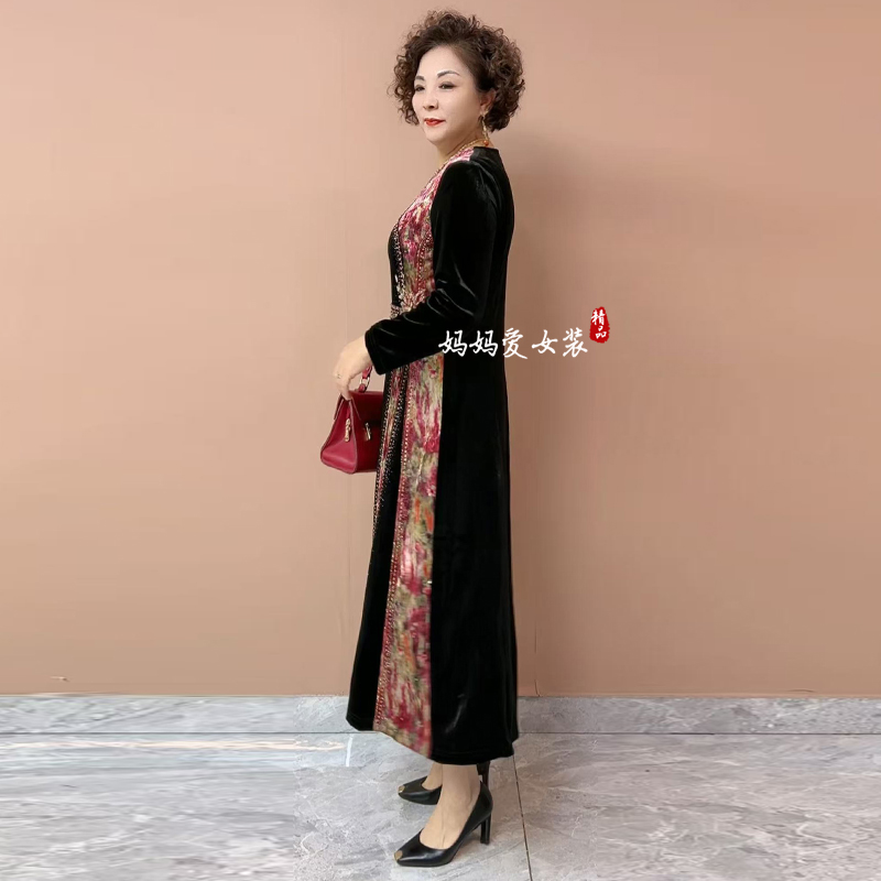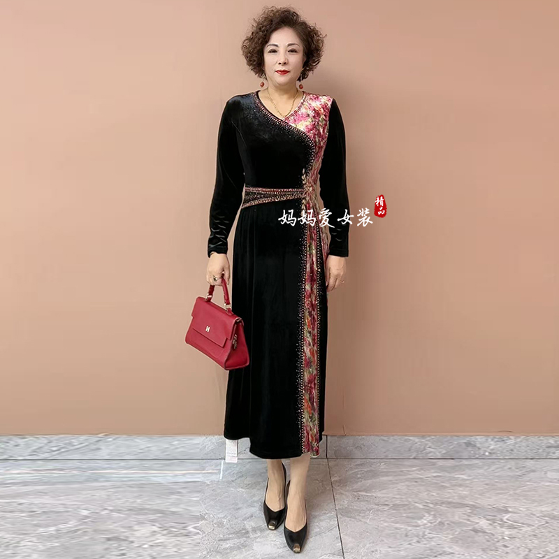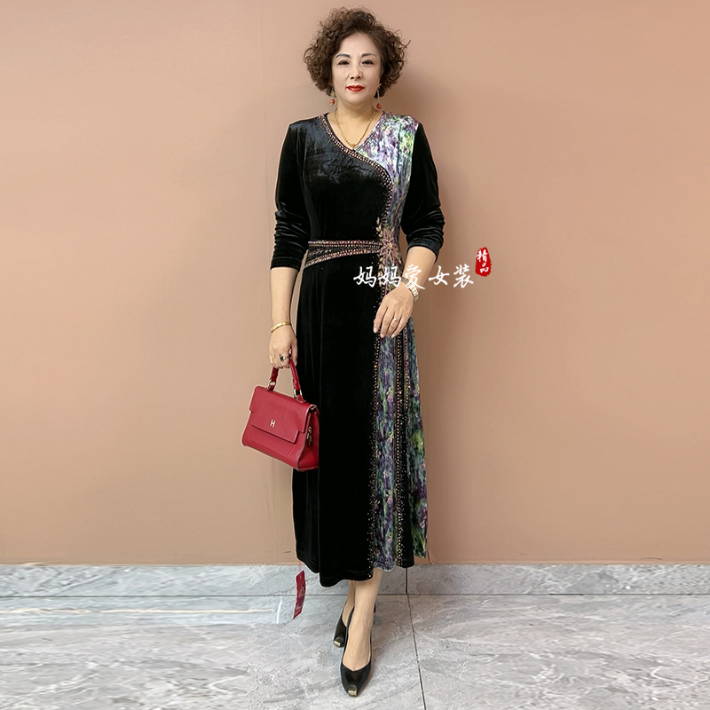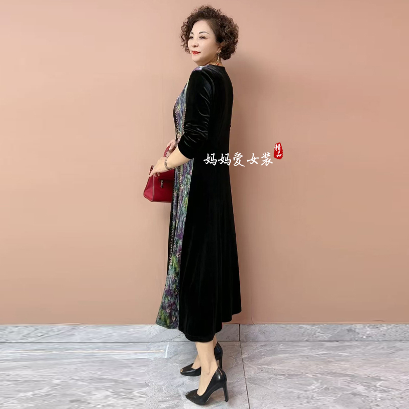 高贵妈妈丝绒连衣裙秋季新款高品质拼接设计大码收腰显瘦气质长裙 - 妈妈爱 经典工厂店