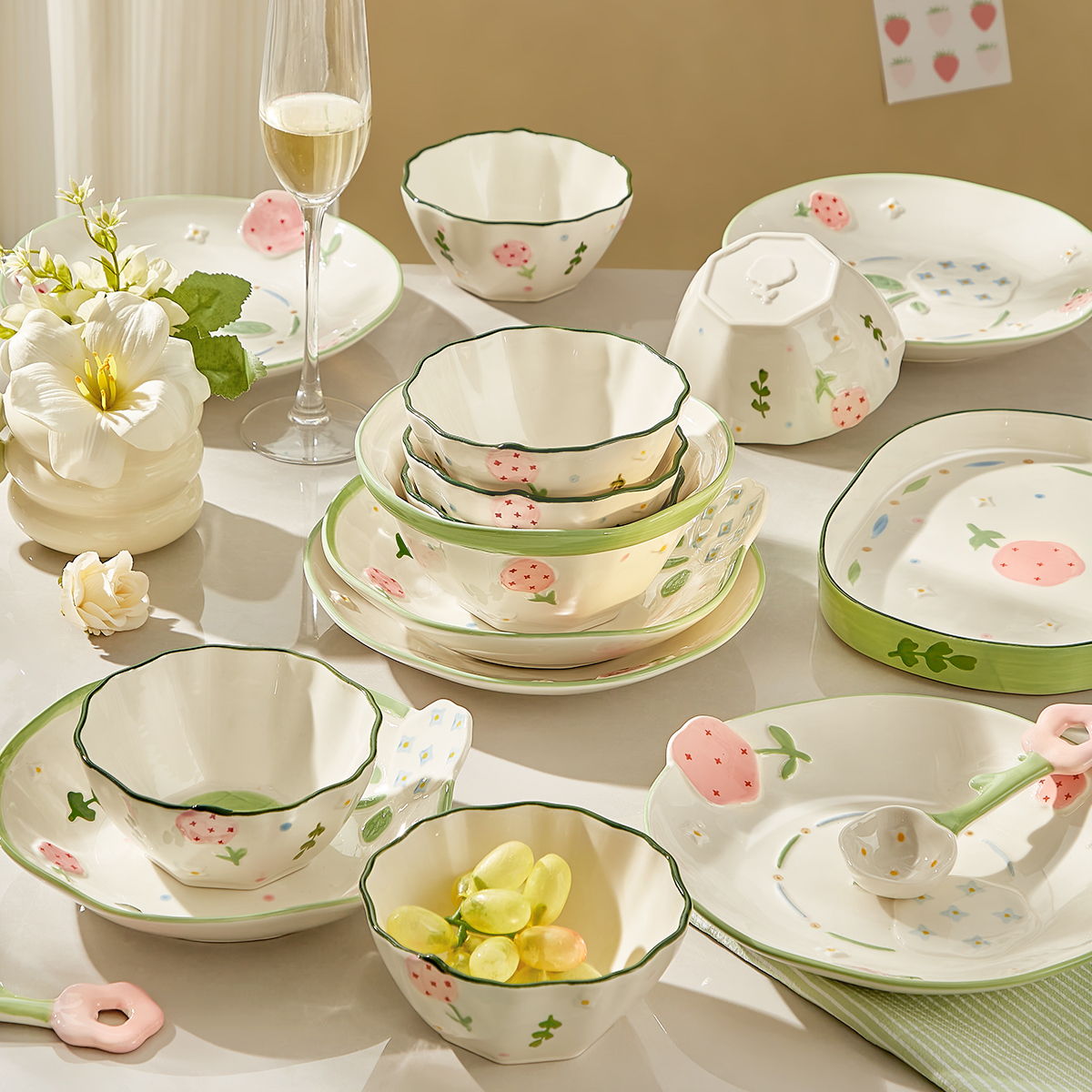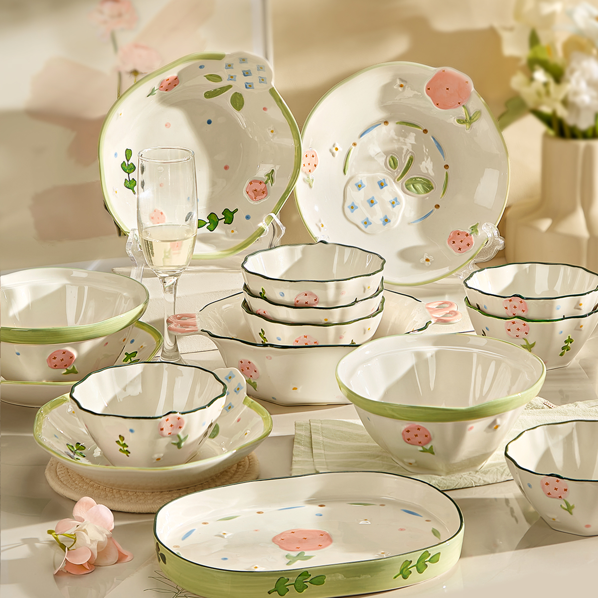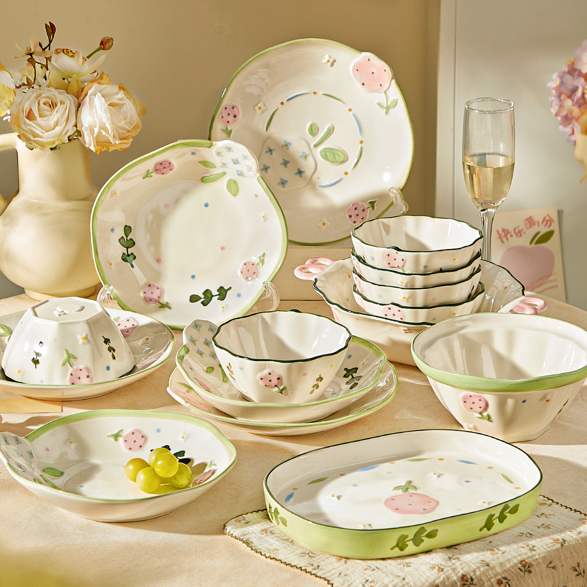 清新碗碟套装家用陶瓷碗盘子碗筷釉下彩乔迁新居碗具送礼餐具礼盒 - 漆描金器商城