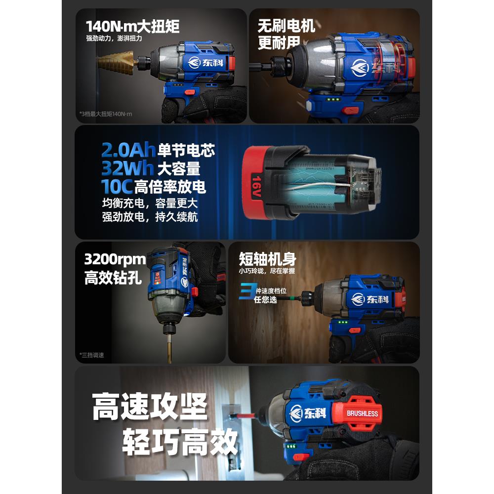 东科16V无刷锂电冲击起子机家用140牛电动螺丝刀电钻充电式螺丝批