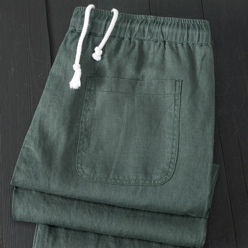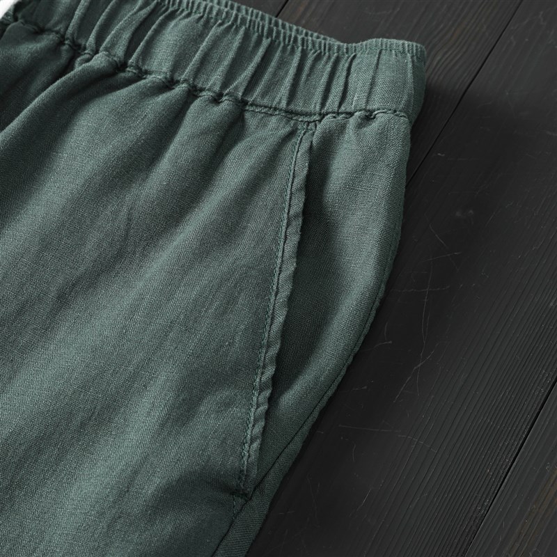 夏季墨绿色纯亚麻小脚口九分裤轻薄透气吸湿排汗抽绳松紧腰直筒裤 - 月顺楼商城