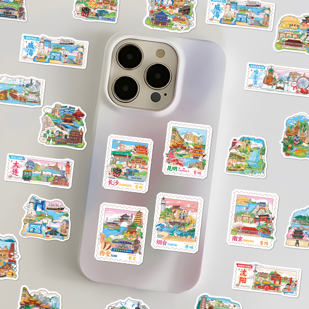 116张城市邮票特色地标创意美食小卡装饰手机壳墙面贴纸diy手账本 - 花花班
