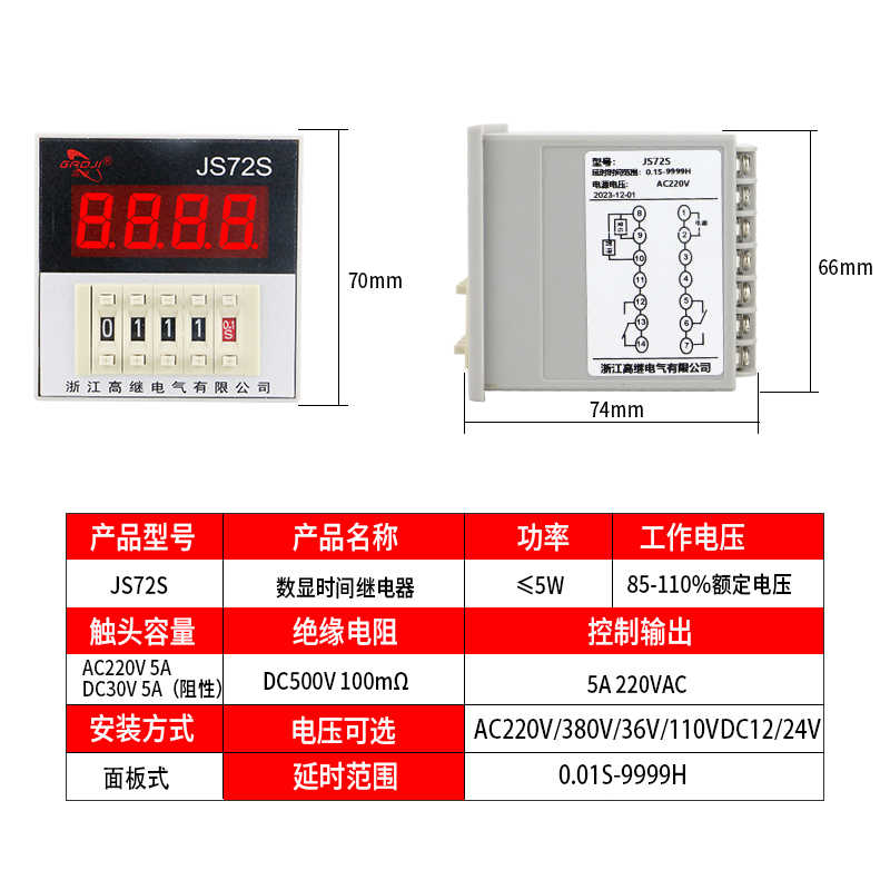 通电延时数显式时间继电器JS72S面板安装220V定时器JSS72 DC24V