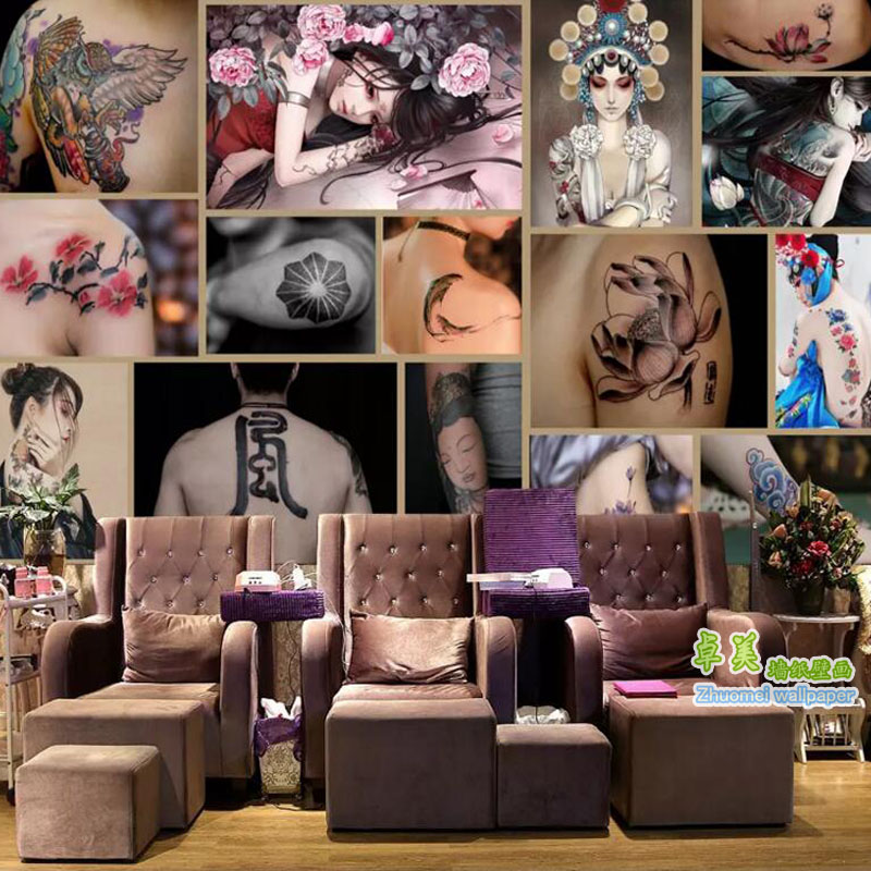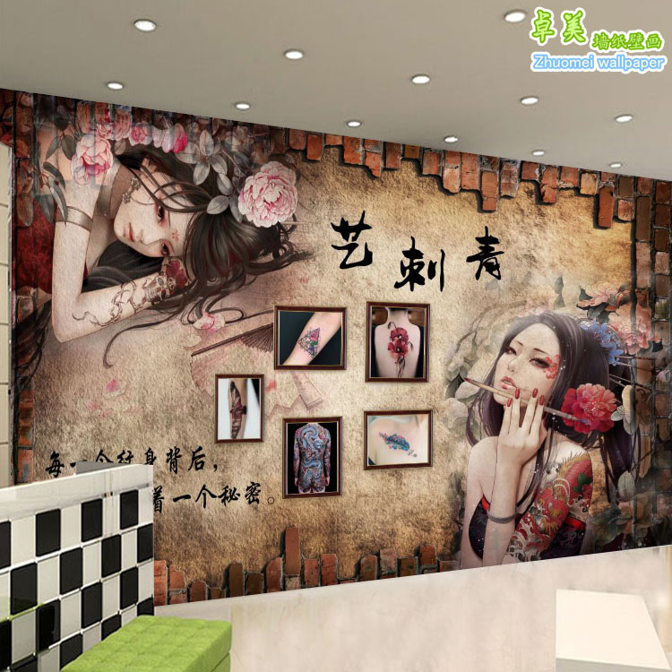 个性纹身店工作室背景墙纸时尚3d复古砖墙J刺青艺术壁纸5d纹绣壁 - tb5621857436