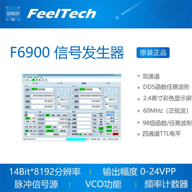 FY6900双通道DDS函数任意波形信号发生器/脉冲信号源/频率计数器
