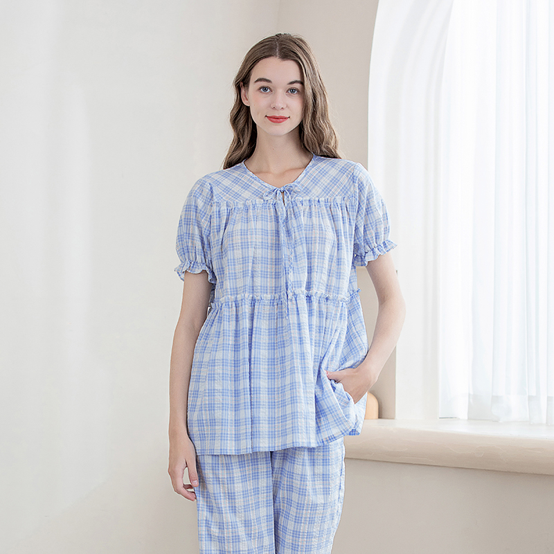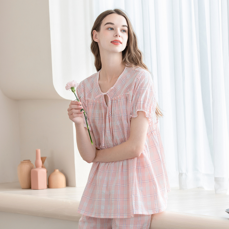 美标旗舰店睡衣女【100%纯棉】夏短袖梭织七分裤睡裙格子纹家居服 - 美标服饰旗舰店